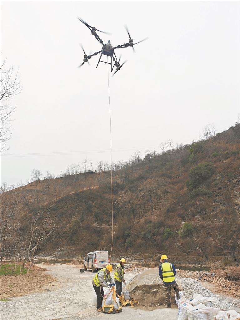 芝阳镇工地所在位置山高坡陡,大型机械无法进场,重载无人机的投入让运输事半功倍。甲方负责人连连称赞:“你们这无人机太厉害了,帮我们省了一半运输成本,还不用修山路,绿色又高效!”