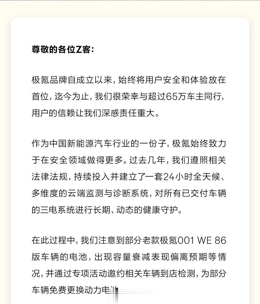 极氪表示,发现2021年7月至2024年3月生产的部分极氪001WE86版车辆,特定批次的动力电池由于内部部件制造一致性原因,长期使用动力电池内阻会异常升高,可能导致部分电池性能下降,极端情况下可能存在安全隐患。为此,极氪方面将对相关车辆进行检查或云端远程诊断,为尚未更换动力电池的车辆免费更换动力电池。