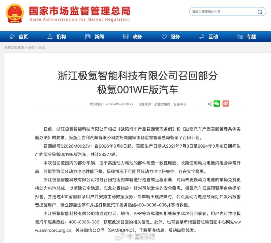 2月9日,极氪官方发文回应召回38277辆001WE版汽车一事。