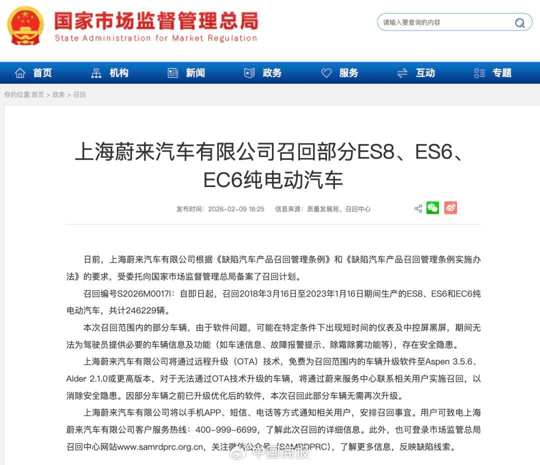 蔚来共有246229辆纯电动汽车被召回,部分车辆由于软件问题,可能在特定条件下出现短时间的仪表及中控屏黑屏。