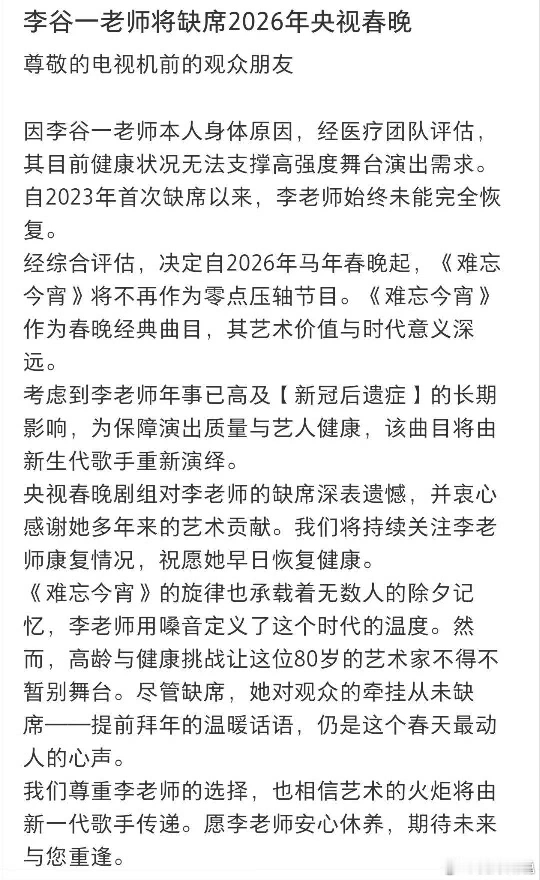 李谷一确认缺席马年春晚连续四年缺席,虽有遗憾,但健康永远是第一位的!