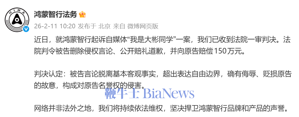 2月11日,鸿蒙智行法务部声明,近日,就鸿蒙智行起诉自媒体“我是大彬同学”一案,已收到法院一审判决。法院判令被告删除侵权言论、公开赔礼道歉,并向原告赔偿150万元。