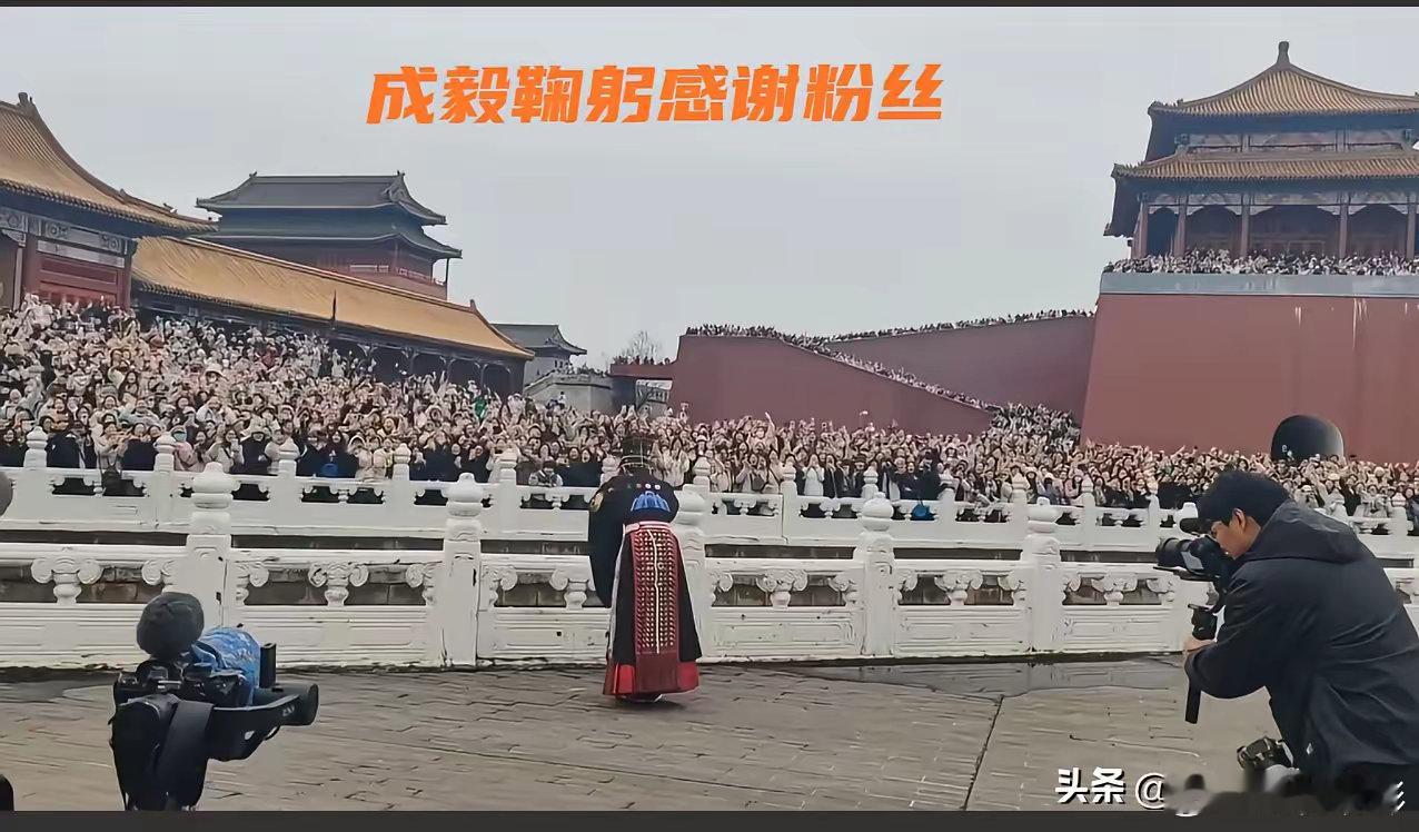 成毅主演古装大剧《两京十五日》正式杀青,横店现场直接被粉丝挤爆!城楼上、广场边全是等候的观众,即便剧组未公开杀青时间,依然挡不住四面八方赶来的热情。最戳人的一幕:成毅身着开机同款龙袍冕服,拍完登基重头戏未卸妆、未换装,径直走向人群。面对人山人海的应援,他双手扶冠、深深鞠躬,一遍遍向粉丝致意,龙袍垂地、姿态谦卑,帝王气场与温柔教养瞬间拉满。现场不止有感动,更有实打实的宠粉:成毅自费安排卡车送奶茶,3500杯不限量供应,贴心调温去糖,被网友称为“内娱逆应援天花板”。他还单膝跪地与粉丝大合影,可爱鼓掌逗笑全场,上一秒是威严太子,下一秒是温柔哥哥。从开机到杀青,百余日潜心拍摄,成毅把朱瞻基的隐忍与贵气演到骨子里;戏外始终谦逊有礼、真诚宠粉。这样的双向奔赴,难怪一出场就引爆全网。期待《两京十五日》早日上线,一起看成毅演绎大明太子传奇!