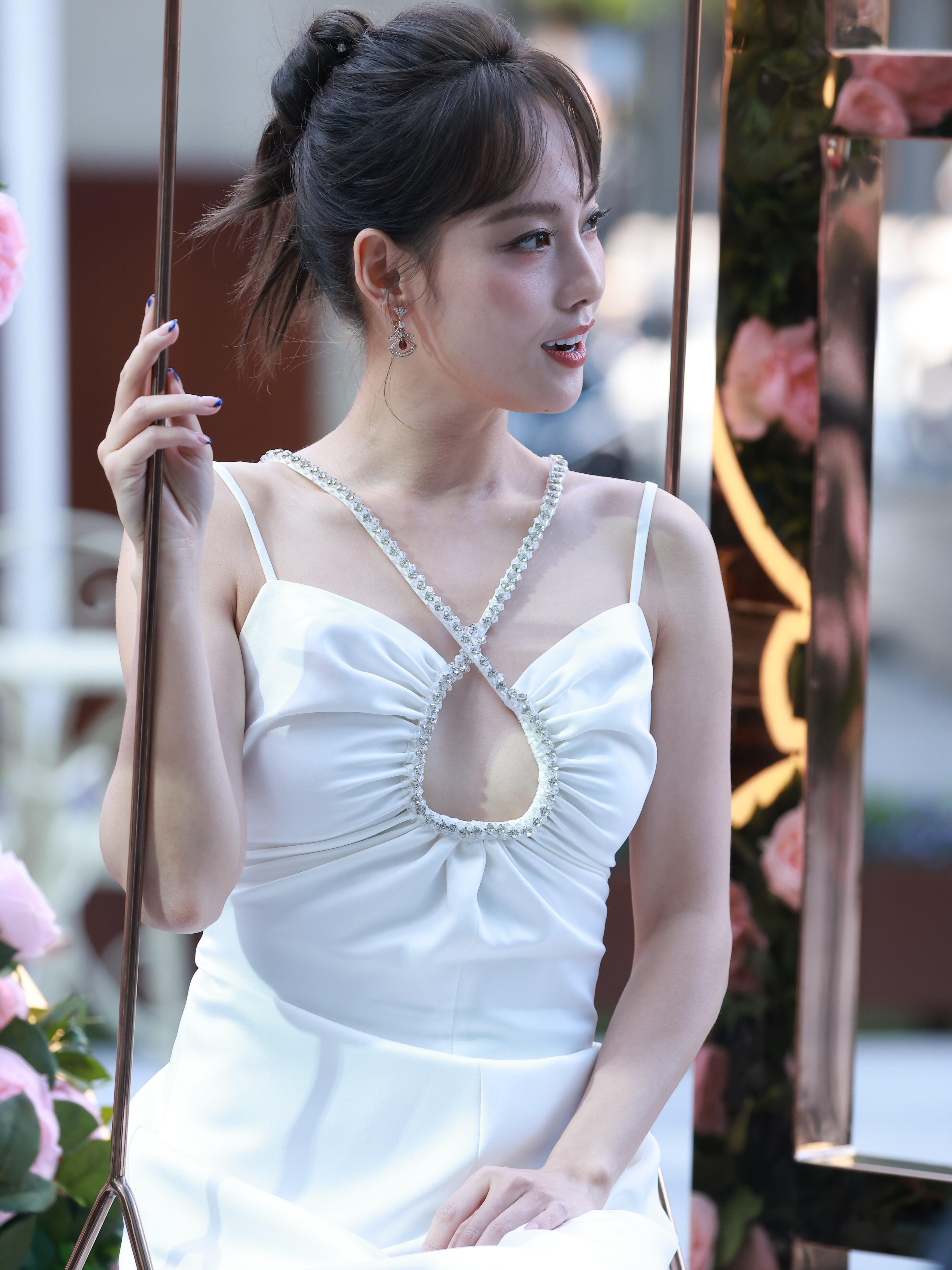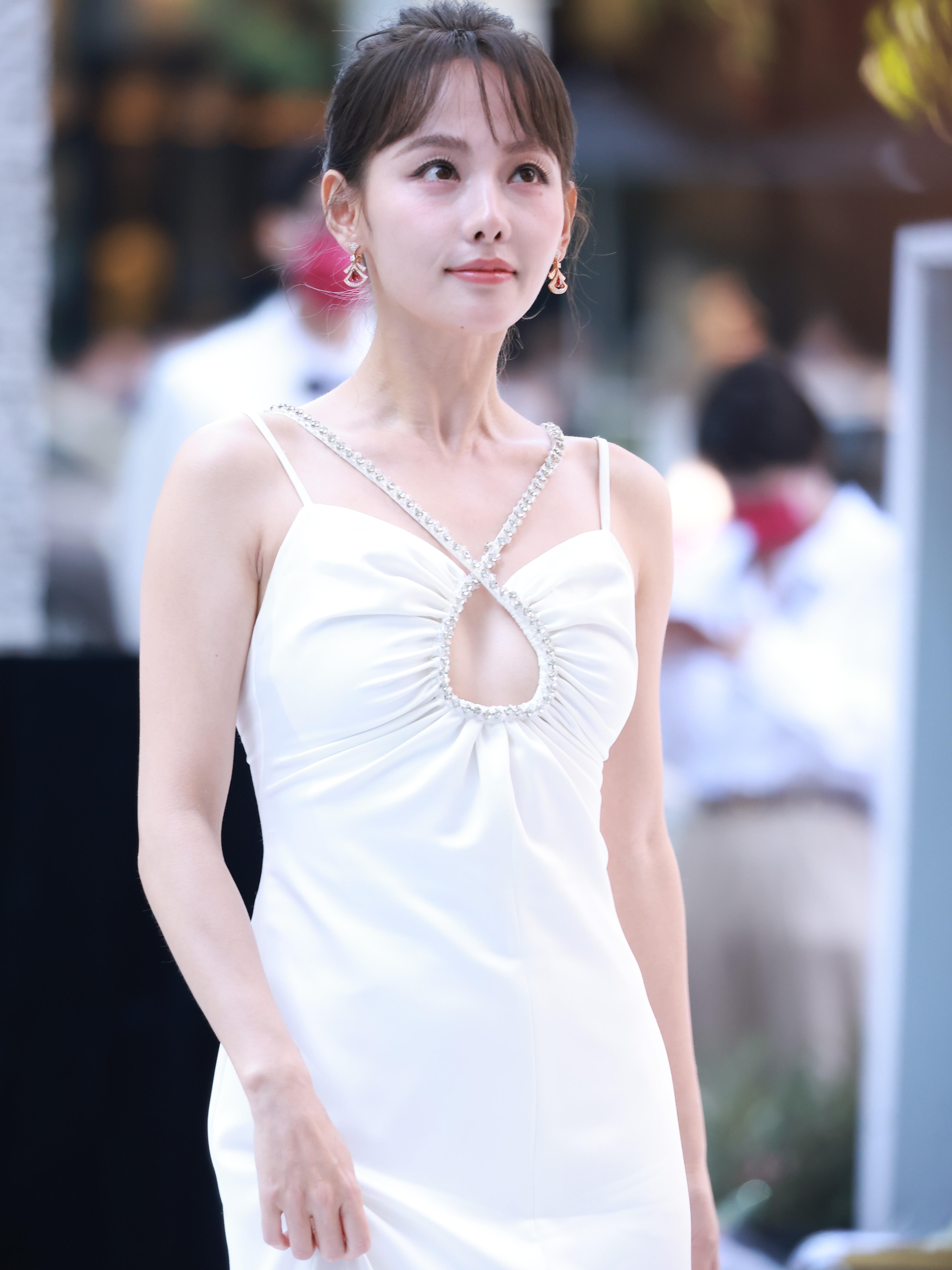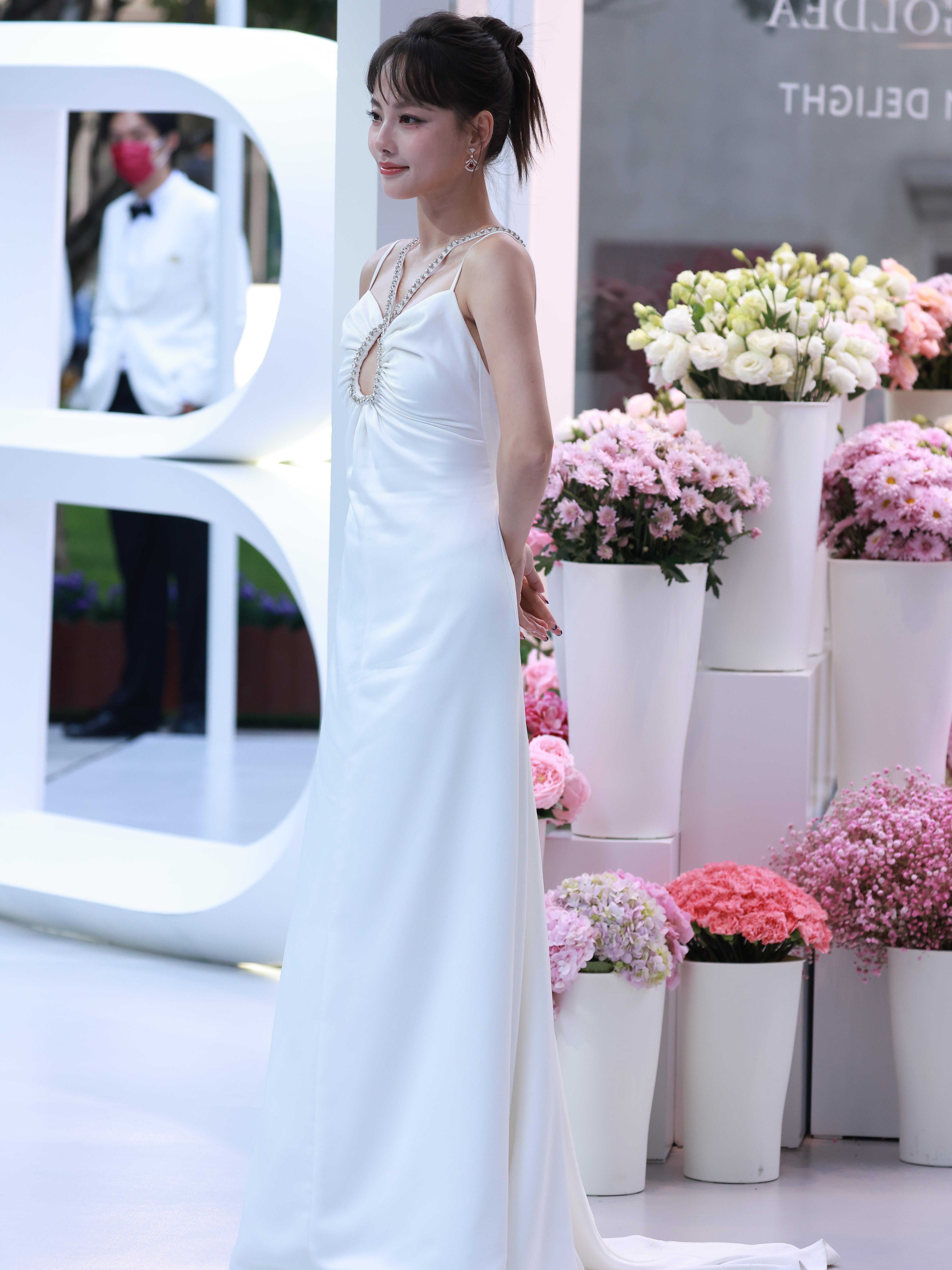 张嘉倪宝格丽活动生图,绝美白色吊带长裙!