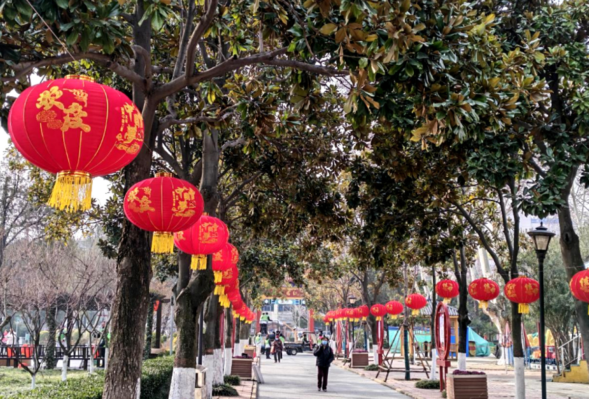 人民公园张灯结彩满园红韵迎新春