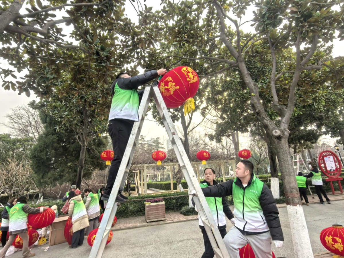 工作人员协作挂灯笼勾勒新春图景