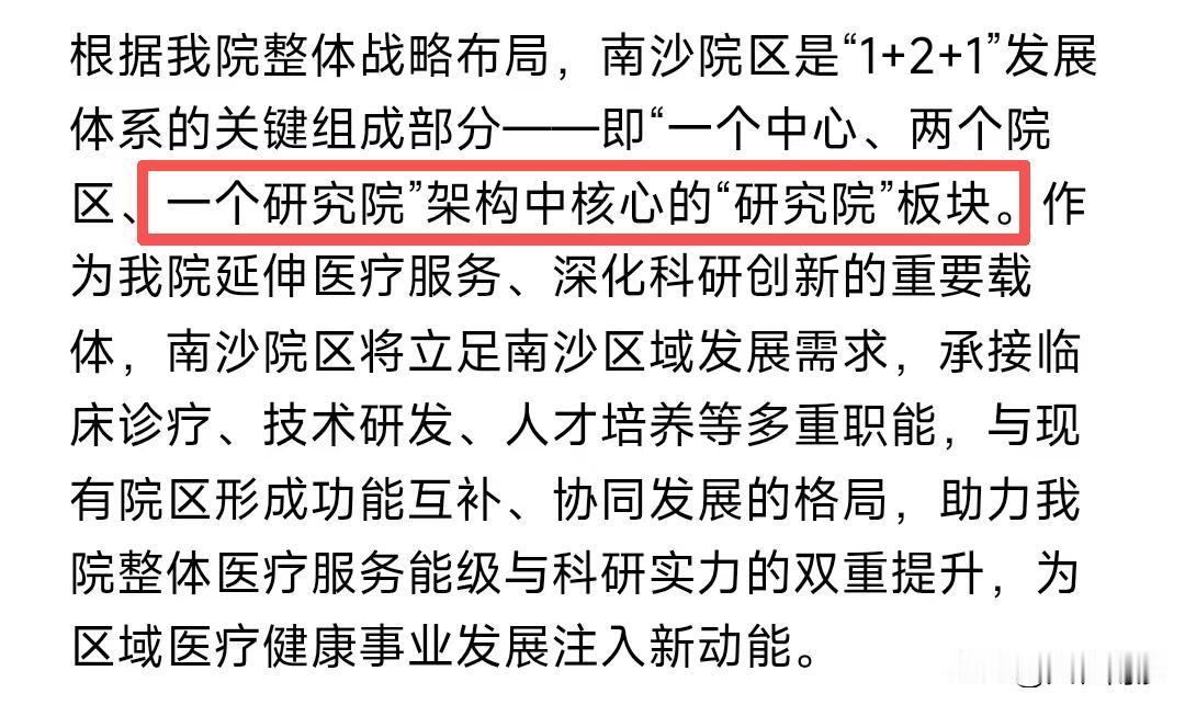 【广州妇幼南沙院区再传好消息】备受关注的南沙大型医院广州妇幼南沙又传来好消息,南沙本地自媒体南沙部落爆料,一份广州市妇女儿童医疗中心的内部文件资料显示“当前重点工作推进情况”,其中南沙院区赫然在列,文件显示南沙院区已全面启动相关设备及系统的招标采购工作,聚焦院区运营核心需求。 很明显南沙院区已经作为医院当前的重点工作。一直在推进中,再次破除了之前被除名的谣言。 另外文件还显示南沙院区除了医疗服务之外,还获得了新的业务支持,那就是研究院。 文件显示,根据市妇儿中心的战略布局,南沙院区是“1+2+1"发展体系的关键组成部分,即“一个中心、两个院区、一个研究院”架构中核心的“研究院”板块。 作为市妇儿中心延伸医疗服务、深化科研创新的重要载体,南沙院区将立足南沙区域发展需求,承接临床诊疗、技术研发、人才培养等多重职能,与现有院区形成功能互补、协同发展的格局,助力医院整体医疗服务能级与科研实力的双重提升,为区域医疗健康事业发展注入新动能。 目前广州妇儿中心拥有国际标准的百万级生物样本库,运行成熟、独具规模的实体儿科研究所和优生围产研究所,建立了广东省儿童早期发展应用工程技术研究中心、广东省儿童健康与疾病临床研究中心、广东省结构性出生缺陷疾病研究重点实验室(第二届粤港澳大湾区卫生与健康合作项目)和全世界规模最大之一的妇幼队列研究平台。但是目前并没有专门的研究院,而这次提到南沙院区要建设研究院,意味着接下来广州市妇幼将会整合各类研究所和研究中心,在南沙建立一个大型的综合性研究院。 不过南沙院区之前规划仅有医院部分,这次新增了研究院,意味着接下来医疗部分的规模和床位将会有一定的缩减。 不过比起单独的医疗,加上了研究院的综合业务加持,可以让整个项目更加多元化。 期待今年会有开业的好消息吧!