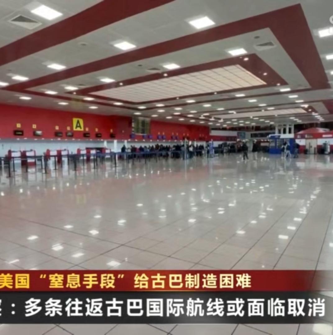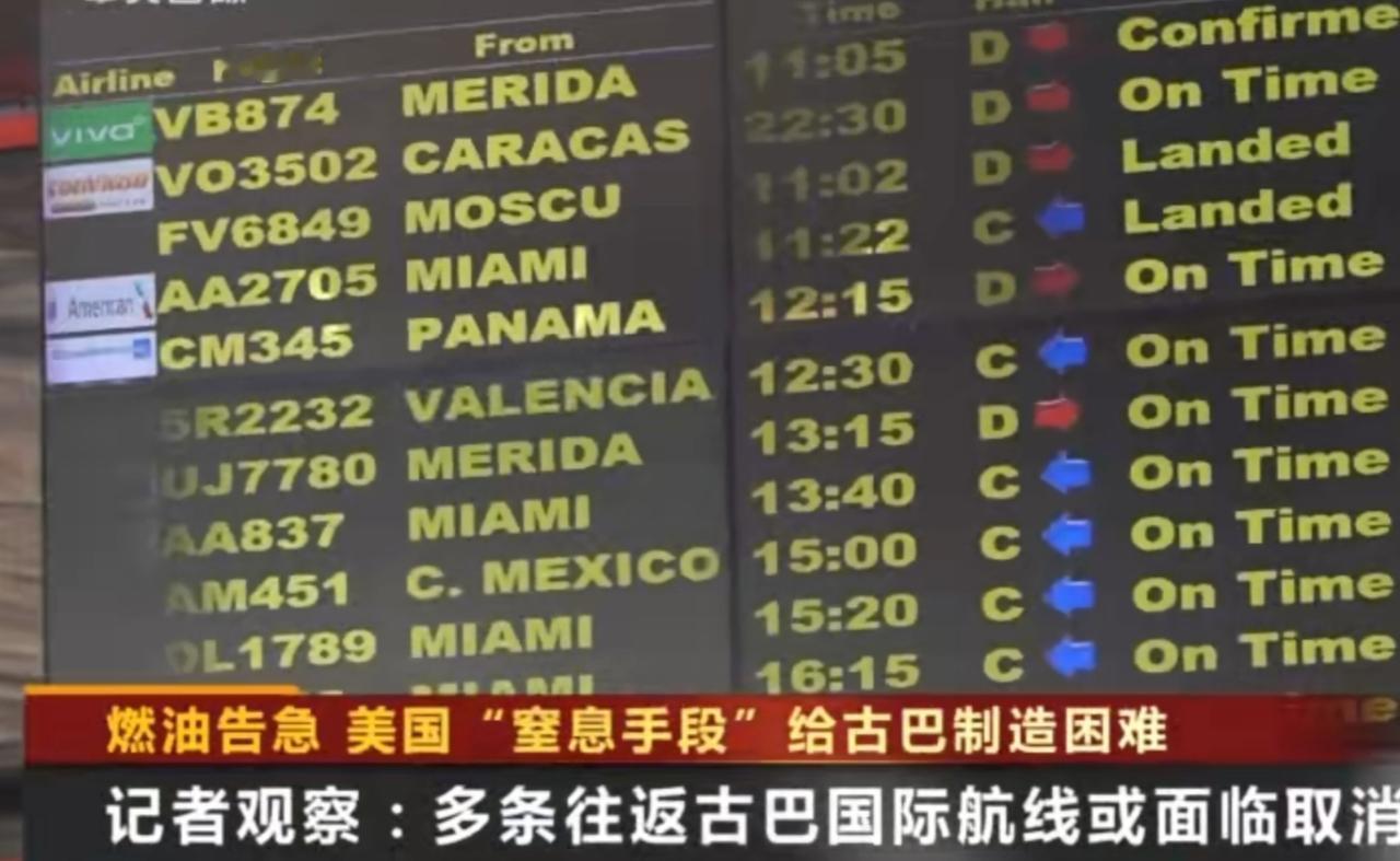 在古巴何塞·马蒂国际机场,受美国长期制裁导致的燃油短缺影响,多条国际航线正面临停飞危机。机场大屏上,飞往梅里达、加拉加斯、巴拿马等地的航班信息闪烁,部分已标注“取消”。总台记者史跃在现场直击,受燃油供应不足冲击,多家航司被迫调整运力,旅客出行受阻,这一“窒息手段”正严重影响古巴的航空业与民生。