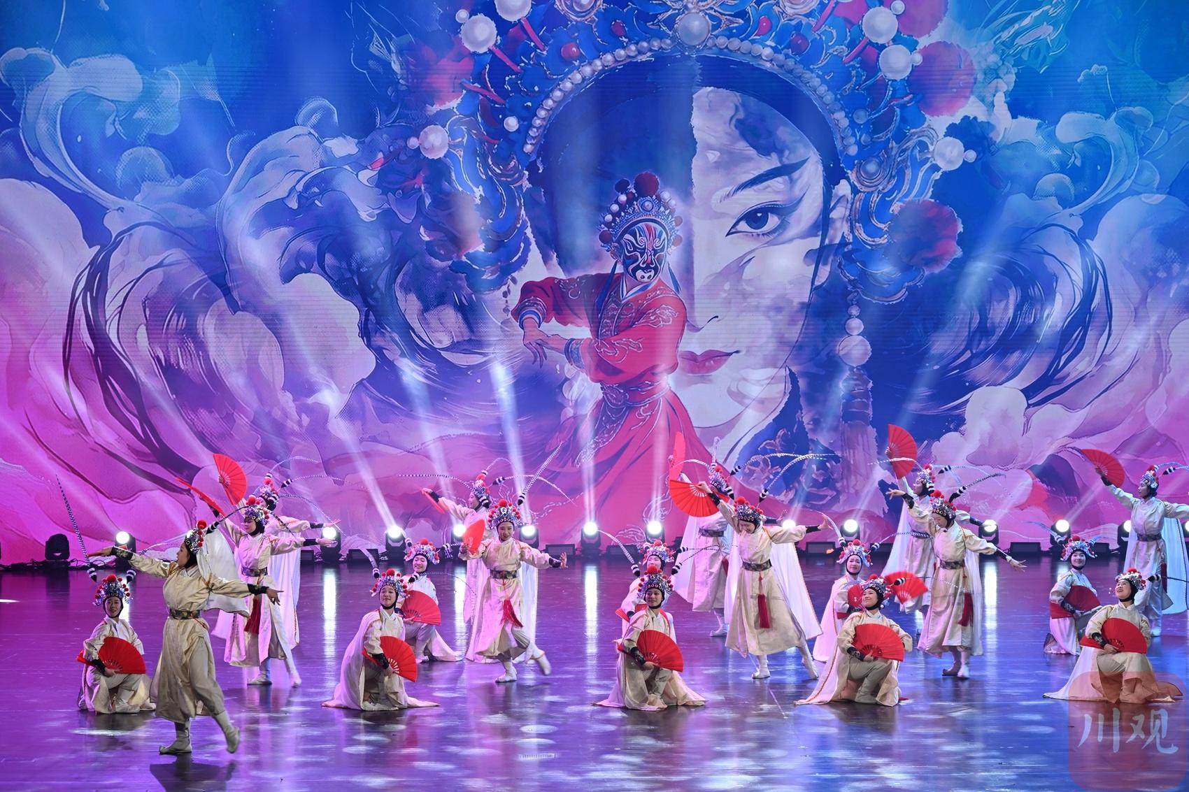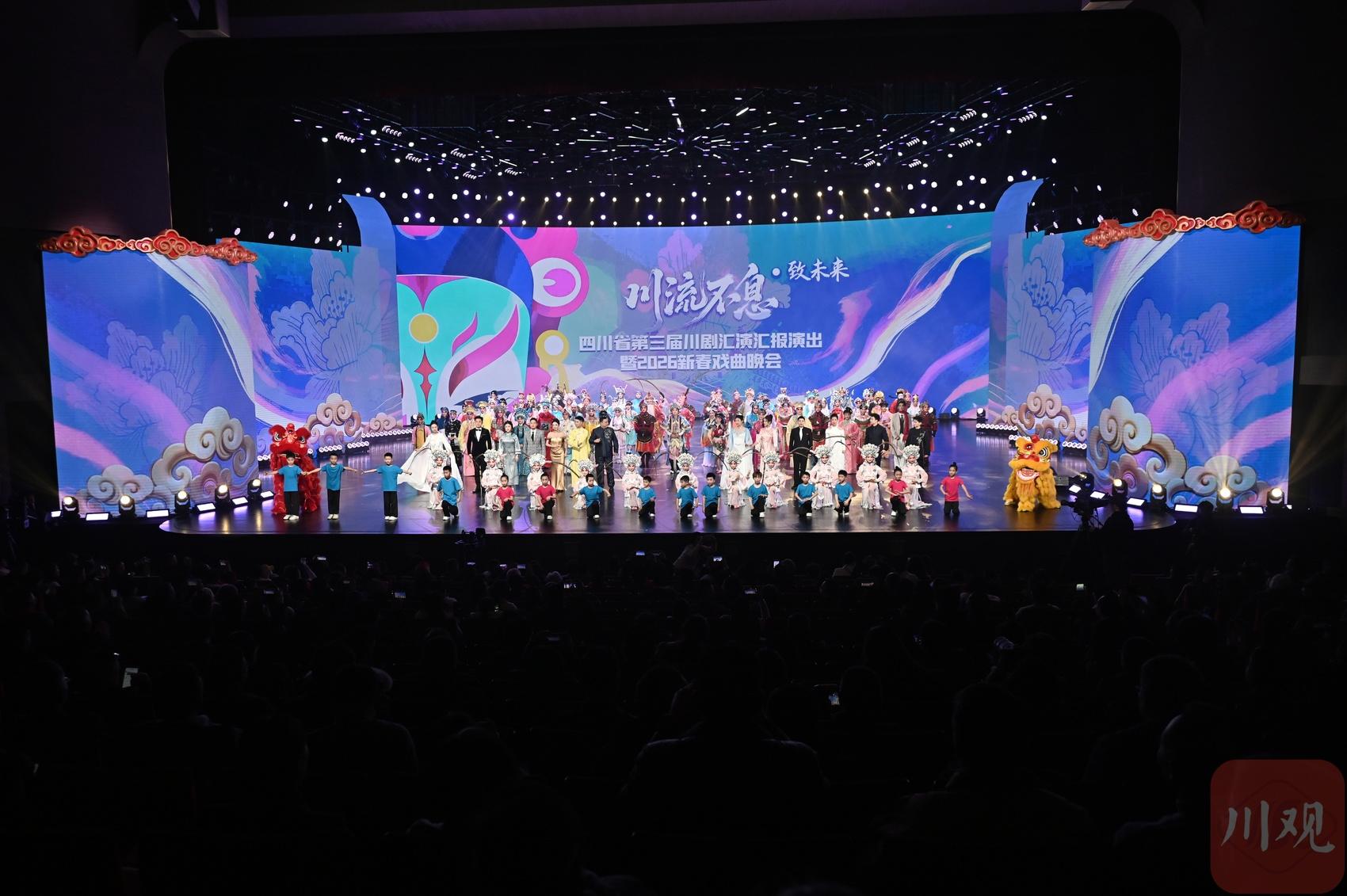 演出尾声,川剧名家陈智林、陈巧茹领衔,与青年演员共同唱响《川流不息・致未来》,为晚会画上圆满句号。整场晚会新老演员同台献艺,经典剧目与新创佳作百花齐放,展现了川剧艺术薪火相传、蓬勃向上的生机活力。