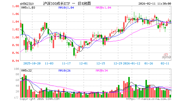 2月11日,截止午间收盘,沪深300成长ETF(562310)跌0.48%,报1.039元,成交额846.49万元。沪深300成长ETF(562310)重仓股方面,宁德时代截止午盘涨0.60%,贵州茅台跌0.45%,中际旭创跌5.57%,紫金矿业涨2.22%,新易盛跌5.77%,立讯精密跌0.37%,寒武纪跌1.72%,恒瑞医药涨0.39%,比亚迪涨1.76%,阳光电源跌1.66%。