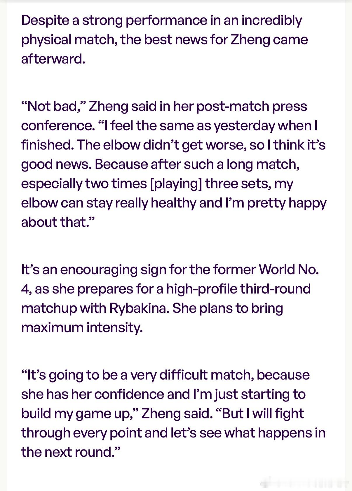 在多哈第二轮赢下帕克斯,郑钦文在赛后采访中透露手肘状态目前还不错。