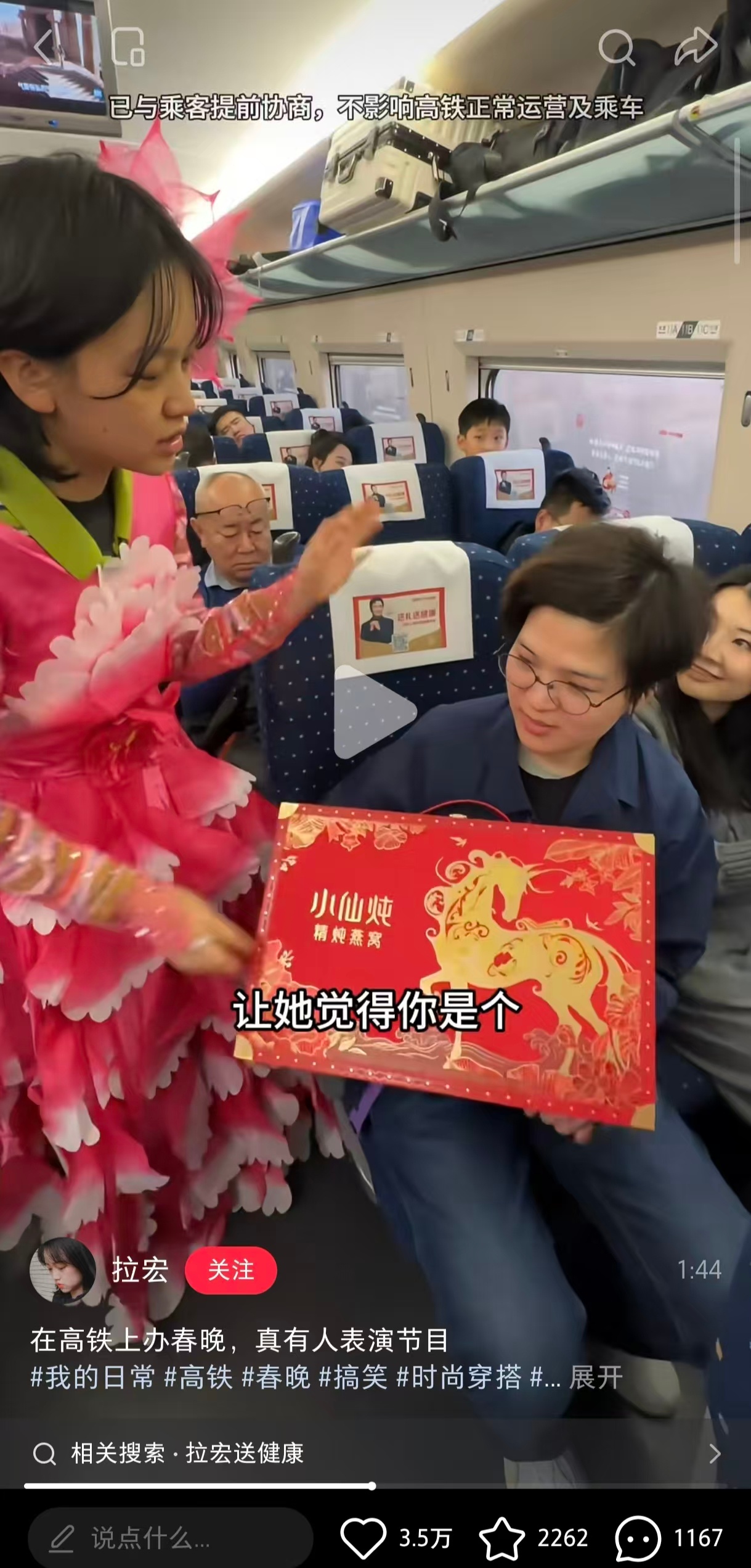 拉宏高铁上开e人春晚 证明了:只要我不尴尬,尴尬的就是别人。这波“静音表演”我打满分!在高铁上又是吹笛又是变魔术,还顺便把京东健康大礼包里的健康祝福“人传人”了。最戳我的是最后送礼物的环节,搞怪之余心系长辈健康。这种反差感真的很有爱,看完想立刻飞奔回家。🥰