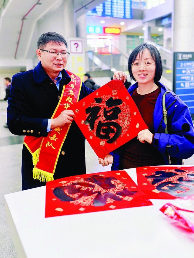 法家走进惠州或车站,现场书写春联和“福”字,赠送给南来北往的旅客。