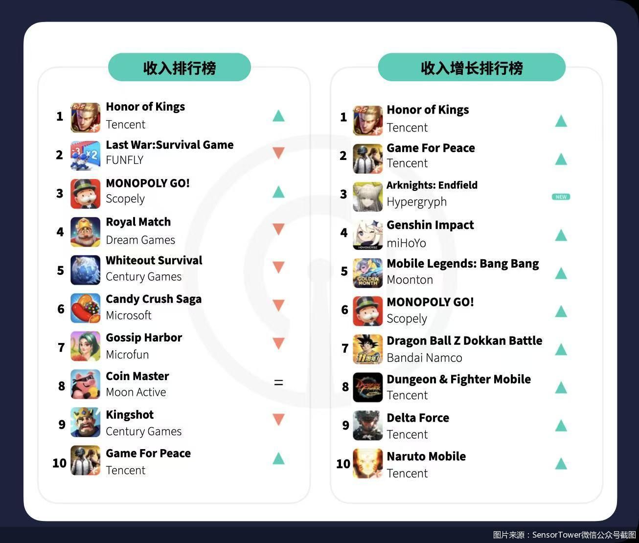 多款腾讯旗下的其他游戏也展现出强劲的回升势头。《地下城与勇士》手游凭借进度驱动的版本更新和长线运营活动排名攀升;《三角洲行动》受益于竞技射击赛季刷新以及在中国和东南亚市场推出的高级内容投放;《火影忍者》手游则在IP驱动的活动和以角色为核心的更新推动下,重新激活了长期拥趸的消费,成功跻身前十。