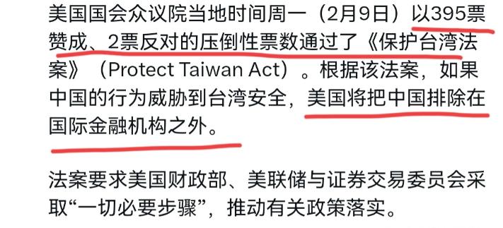 美国完全没有把我们的警告听进去,美国做了一个硬动作声称,如果中国的行为威胁到台湾安全,美国将把中国排除在国际金融机构之外。 提出这个法案的卢卡斯还说,这是要给中国传递明确信号,要是敢和台湾发生冲突,就得承担严重后果,而把中国踢出这些国际组织,就是惩罚措施里的重要一环。 目前这个法案已经过了众议院,接下来要送到参议院审议,能不能最终生效还不好说,但美国这种针对中国的强硬态度已经很明显了。 咱们得先弄明白这些国际金融机构到底是干嘛的,其实就是世界各国一起参与的组织,有的管国际间的钱怎么结算,有的管给国家贷款搞建设,还有的制定银行业的规则,简单说就是全球金融领域的 “协调机构” 和 “规则制定方”。 美国之所以想把中国排除出去,核心原因是这些年中国经济发展快,人民币在国际上用得越来越多,美国觉得这动摇了美元的霸权地位。 美国在金融方面优势很大,控制着不少全球金融基础设施,主导着这些国际金融机构,之前就一直通过各种法案遏制人民币,比如限制其他国家在国际货币基金组织里把资产换成人民币,还在七国集团里搞规则,抵制中国的数字人民币。 但美国这个想法看着厉害,实际要做到可没那么容易。 首先,这些国际金融机构不是美国一家说了算的,就拿大家常提的 SWIFT 支付系统来说,它总部在比利时,欧洲国家占了大部分董事会席位,美国只占两席,要踢走一个国家得多数同意才行。 欧洲国家比如德国、法国,很多企业都依赖中国市场,德国的汽车、法国的空客,每年从中国赚不少钱,要是跟着美国制裁中国,没法和中国做贸易结算,这些企业就得停工,工人饭碗都受影响,所以欧洲肯定不会轻易同意。 再说说中国这边,也早就做了准备,不是没应对办法。 这些年中国搞了自己的人民币跨境支付系统,也就是 CIPS,现在已经覆盖 189 个国家,1.3 万家金融机构,不管是东南亚买水果,还是中东买石油,都能用人民币通过这个系统结算,速度比美国主导的系统快,成本还低。 还有数字人民币,已经和 29 个国家打通了跨境支付,转账几秒钟就能到账,不用再经过美元周转。 另外,中国还在不断增加黄金储备,到 2025 年已经突破 2279 吨,黄金是硬通货,就算不用那些国际支付系统,拿着黄金也能换资源,不怕被卡脖子。 美国这么做其实是损人不利己。 先说说对美国自己的影响,中国现在还持有几千亿美元的美国国债,如果真被制裁,中国可能会抛售这些国债,到时候其他国家跟着抛,美国政府借钱的成本会翻好几倍,连军费、社保都可能没钱付。 而且美国很多大企业,比如特斯拉、苹果,都依赖中国的零部件供应,要是结算断了,生产线就得停,每天损失都得超亿美元,还会影响美国的就业。 更重要的是,美国每年靠美元霸权能赚几千亿美元的 “铸币税”,就是印钱换别的国家的商品,要是各国都因为美国的制裁开始不用美元,这笔钱就没了,美国的财政赤字会更严重。 对全球来说,这种做法也会带来麻烦。现在很多国家已经开始 “去美元化” 了,澳大利亚、巴西这些国家和中国做生意,都开始用人民币结算,就是怕哪天和美国有矛盾,资产被冻结。 之前美国制裁俄罗斯,冻结了俄罗斯几千亿美元资产,让全世界都看清了美元不是绝对安全的。 如果美国再制裁中国,会让更多国家放弃美元,导致全球金融市场动荡,新兴国家的经济会受更大影响,可能面临通胀和金融风险的双重压力。 还要说说台湾方面的情况,民进党当局一直迎合美国,把台湾的安全交给美国,但这个法案连台湾网友都不买账,很多人说美国这是明确不会出兵,只会搞这种没用的制裁,还有人嘲讽说之前关税战都没效果,金融封杀更没用。 其实美国和台湾所谓的 “安全关系”,依据的是美国的 “与台湾关系法”,这根本不是国际条约,没有国际效力,台湾指望美国保护,根本不现实。 中国在台湾问题上的立场一直很坚定,之前多次警告美国,不要干涉中国内政,不要向 “台独” 势力发出错误信号,但美国根本没听进去。 这次提出的 “台湾保护法案”,本质上就是美国想通过金融手段施压中国,遏制中国发展,维护自己的霸权。 但现在的情况已经和以前不一样了,中国是 160 多个国家的最大贸易伙伴,是全球制造业中心,在国际金融领域的话语权越来越重,不是美国想打压就能打压的。 美国这个硬动作,看着是针对台湾问题的制裁,实际是冲着遏制中国、维护美元霸权来的。 但因为涉及到很多国家的利益,美国很难真正落实,而且中国有足够的应对能力,不会因为这种威胁就放弃国家主权和领土完整。 台湾是中国的一部分,这是国际社会公认的事实,美国不管搞什么小动作,都改变不了这个事实,反而会损害自己的利益,破坏全球金融秩序。