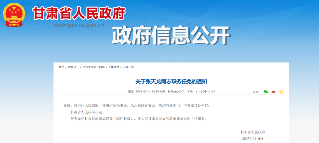 储能与电力市场获悉,2月11日,据甘肃省人民政府消息,张天龙任甘肃省能源局局长(副厅长级),免去其甘肃省发展和改革委员会副主任职务。