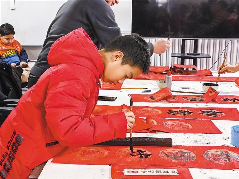 ◀小朋友在书法体验区写对联。本报通讯员尹征摄