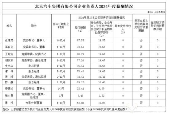 北汽集团其他高管的薪酬也还行。比如,时任北汽集团党委副书记的蒋自力,2024年应付薪酬73.61万元,社会保险、企业年金等单位缴存部分19.67万元,合计93.28万元,平均月薪约7.8万元;北汽集团副总经理胡汉军应付薪酬77.2万元,加上社会保险、企业年金等单位缴存部分19.67万元,合计96.87万元。