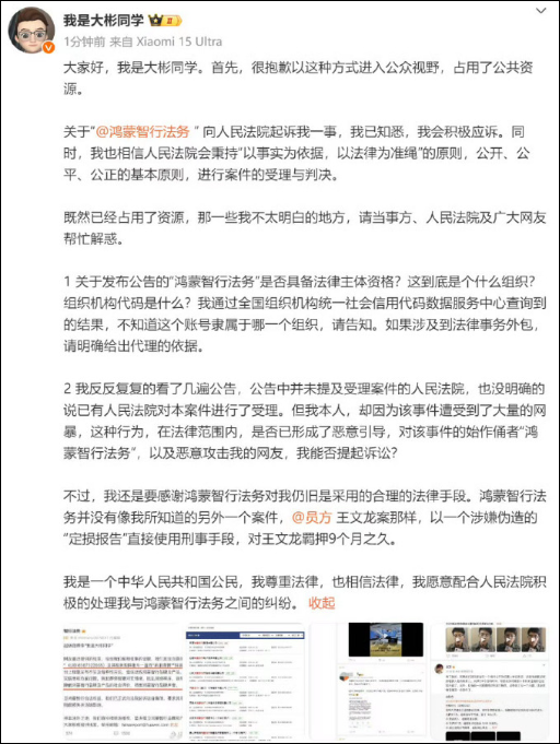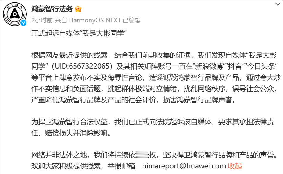 2025年3月11日,鸿蒙智行法务起诉自媒体“我是大彬同学”。