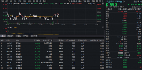 吃喝板块今日(2月11日)回调。反映吃喝板块整体走势的食品饮料ETF华宝(515710)持续低位震荡,截至发稿,场内价格跌0.17%。成份股方面,新诺威大跌超2%,金徽酒跌超1%,水井坊、山西汾酒、泸州老窖等亦跌幅居前,拖累板块走势。