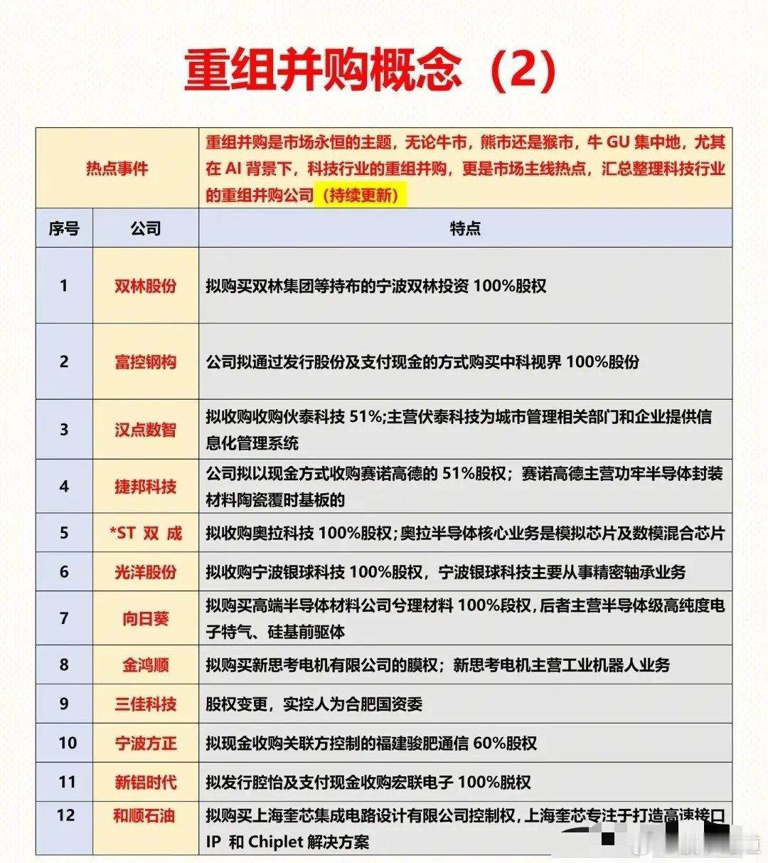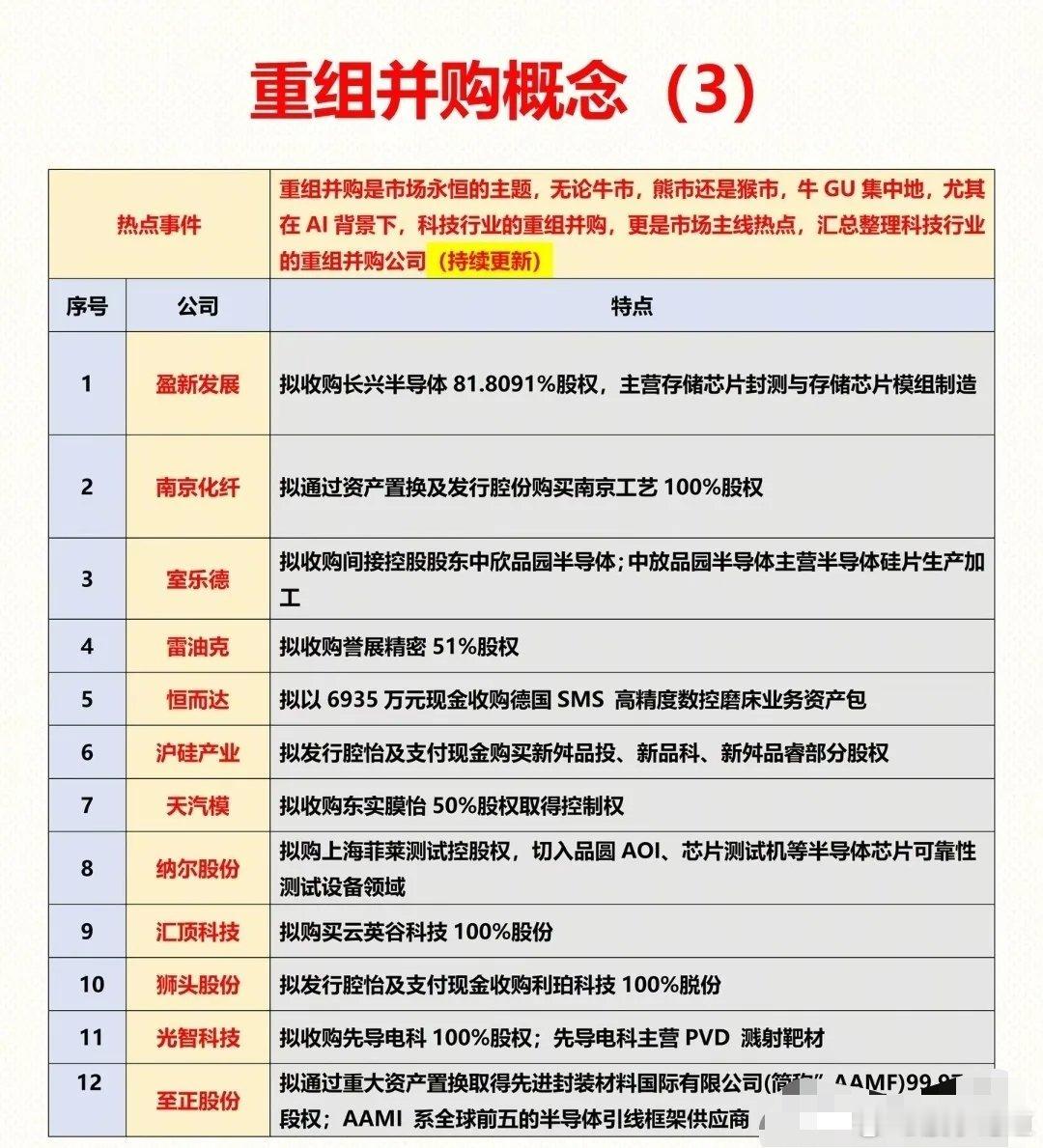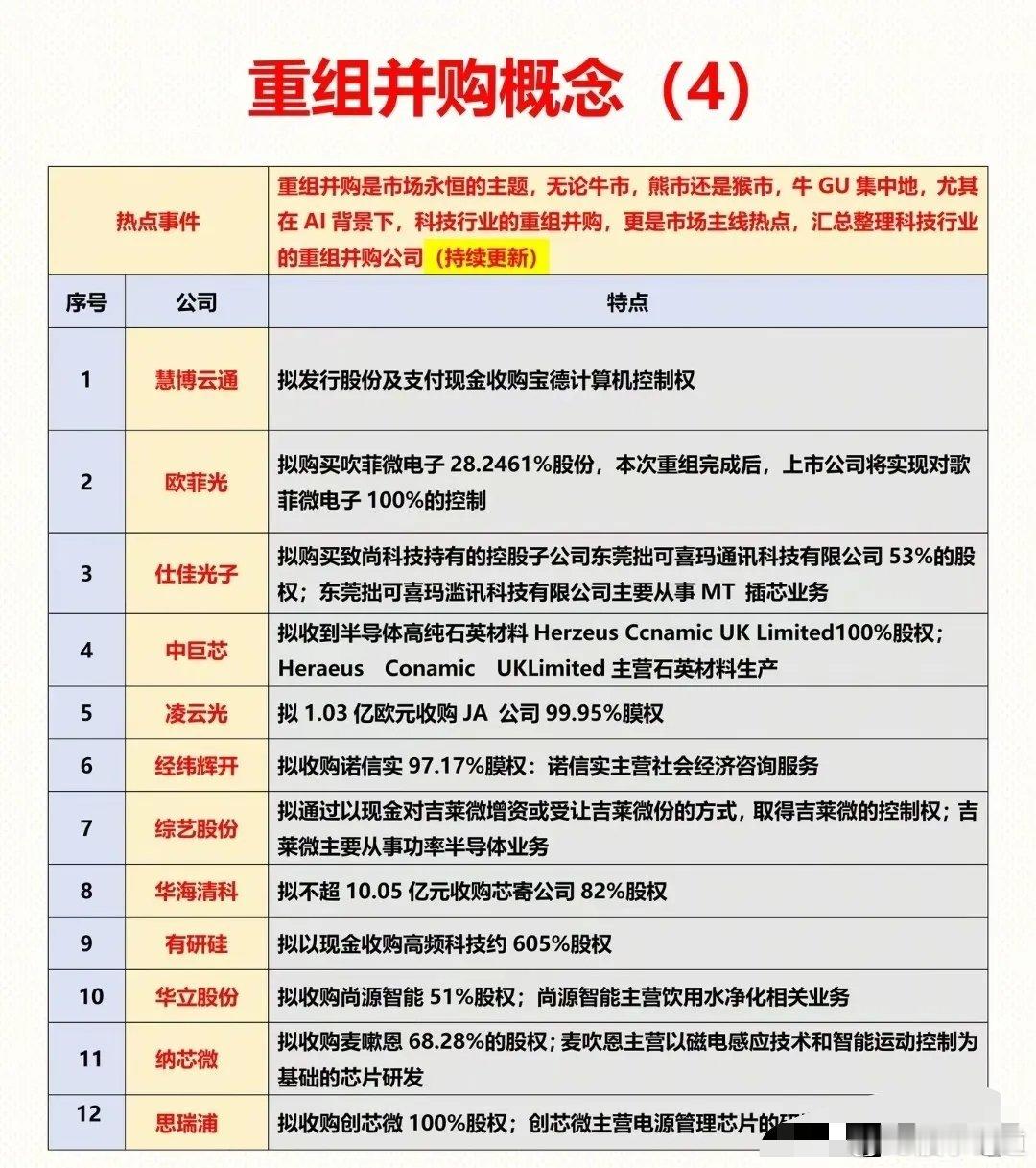 AI浪潮下的重组并购黄金赛道!这72家公司或将引爆市场!重组并购是A股永恒的牛股摇篮,在AI算力、半导体、光模块等科技主线的催化下,相关标的更是资金追捧的核心。科技龙头叠加并购重组概念的公司有浪潮软件、华天科技、慧博云通、光智科技、华东重机、浙江荣泰等等。从已披露的并购标的来看,不少公司正切入AI算力核心环节,比如华东重机收购主营GPU芯片的锐信图芯,金富科技跨界收购AI服务器线缆企业蓝原科技,这些动作都有望重塑公司估值体系,值得重点跟踪。⚠️ 风险提示:重组并购存在不确定性,以上内容仅为信息梳理,不构成投资建议,投资者需结合公司公告和市场走势理性判断。今日看盘股票