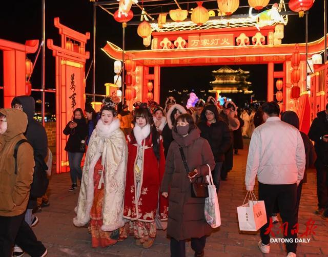 当夜幕来临,古都灯会开灯仪式隆重举行,城门开启,北魏风云扑面而来,鼓乐齐鸣中,身着古装的演员踏灯而行,仿佛一瞬间穿越平城盛世。少年伴塞上繁花起舞,衣袂翻飞融云冈造像意趣,乐声裹着旺火的暖意,让游客惊呼不已,沉醉于鲜活的大同年味儿。