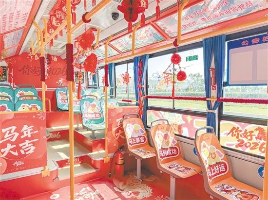 “888路”免费公交专线的车辆,车厢内充满浓浓年味,满眼皆是喜庆的红色。