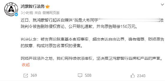 鸿蒙智行法务今日发文称,起诉自媒体“我是大彬同学”一案,已收到法院一审判决。法院判令被告删除侵权言论、公开赔礼道歉,并向原告赔偿150万元。