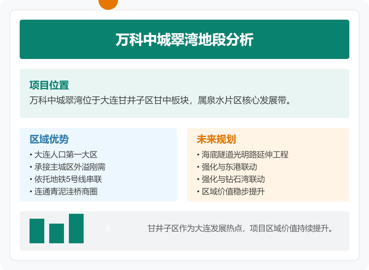 万科中城翠湾位于大连市甘井子区泉水河南中华路北,项目已于2024年4月30日至10月31日完成交房,目前为现房在售状态。由万科地产开发、万科物业提供服务,物业费3.6元/㎡·月,品质有保障。