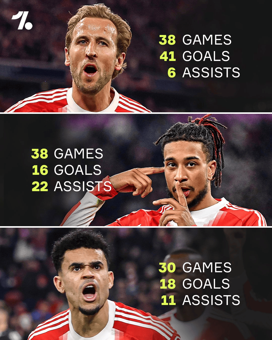 凯恩本赛季38场打进41球,奥利塞和迪亚斯进球、助攻均上双