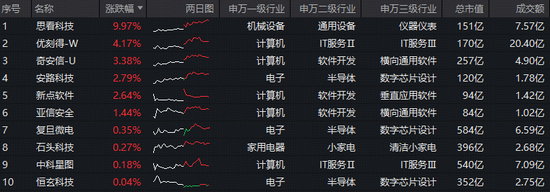 成份股方面,思看科技领涨超9%,优刻得涨逾4%,奇安信、安路科技等个股跟涨。另一方面,澜起科技跌超3%,凌云光跌逾2%,寒武纪跌超1%,跌幅居前,拖累指数表现。