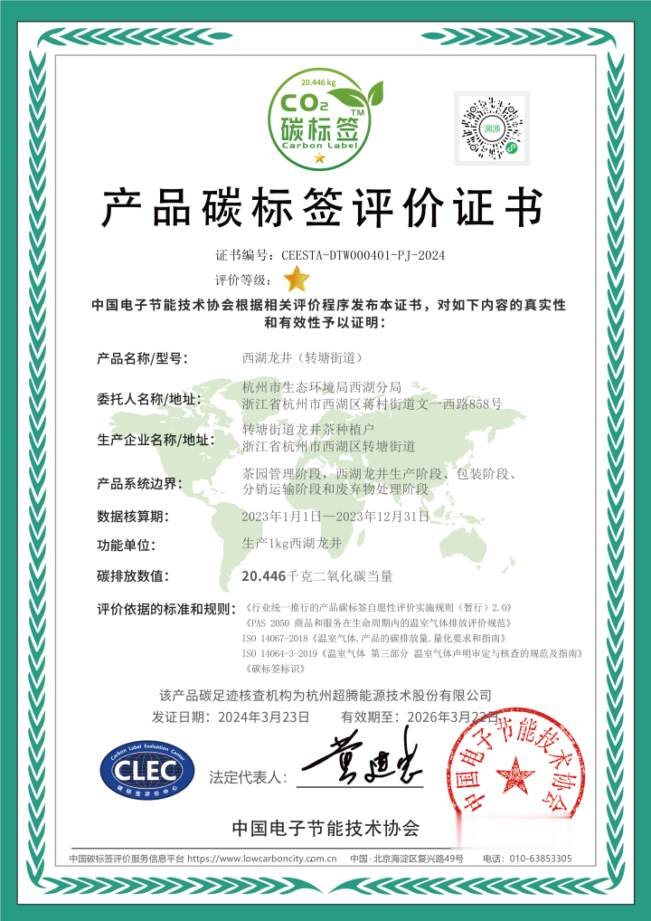 在购买西湖龙井时,你注意到包装上有个小小的碳标签吗?一张碳标签,记录了产品的碳足迹,公开了从生产到营销全生命周期的温室气体排放量。
