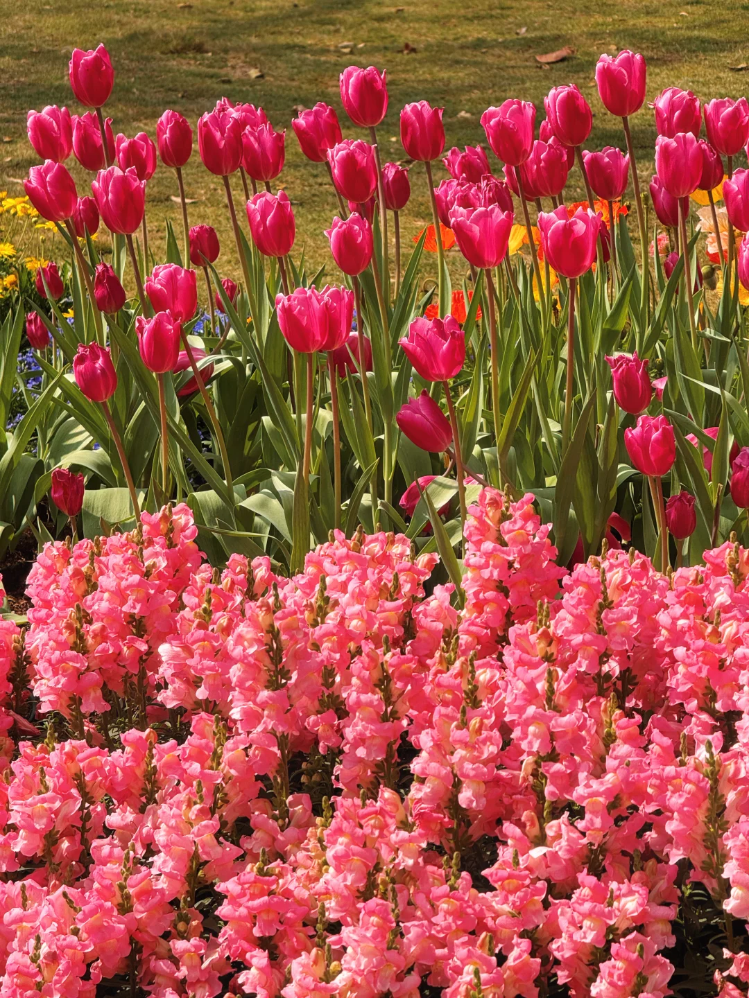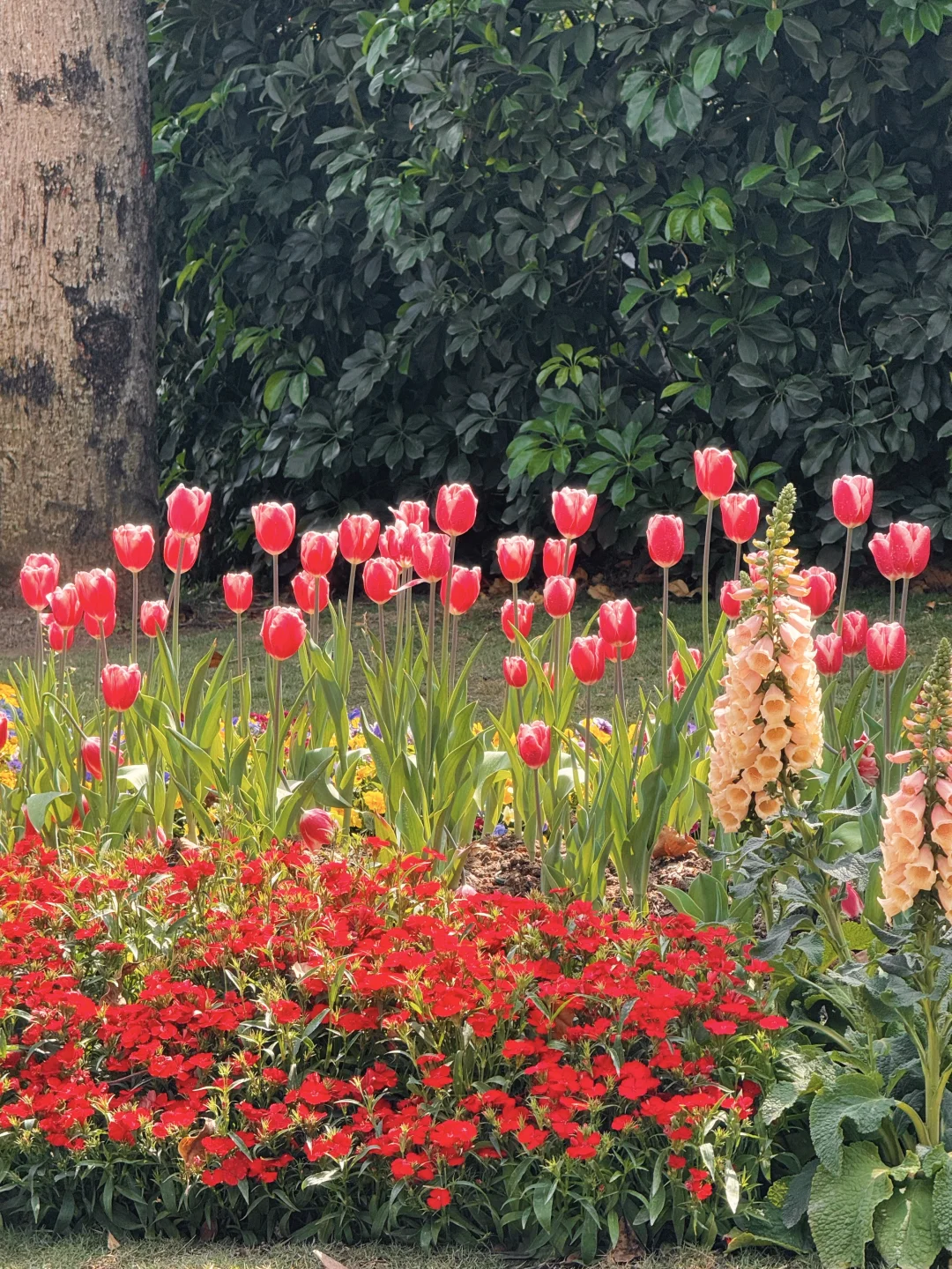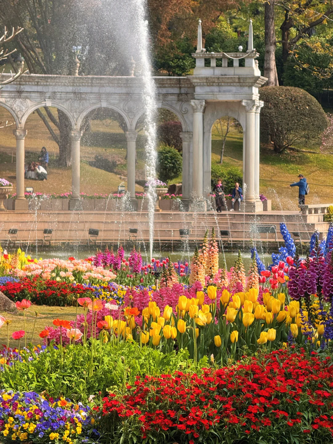 虽然现在的郁金香还只是"一小片"规模,但布置得非常用心,拍照超级出片🌷🌷簇簇饱满的郁金香搭配细碎的小雏菊,再配上园区的罗马柱喷泉湖,仿佛就是莫奈的后花园