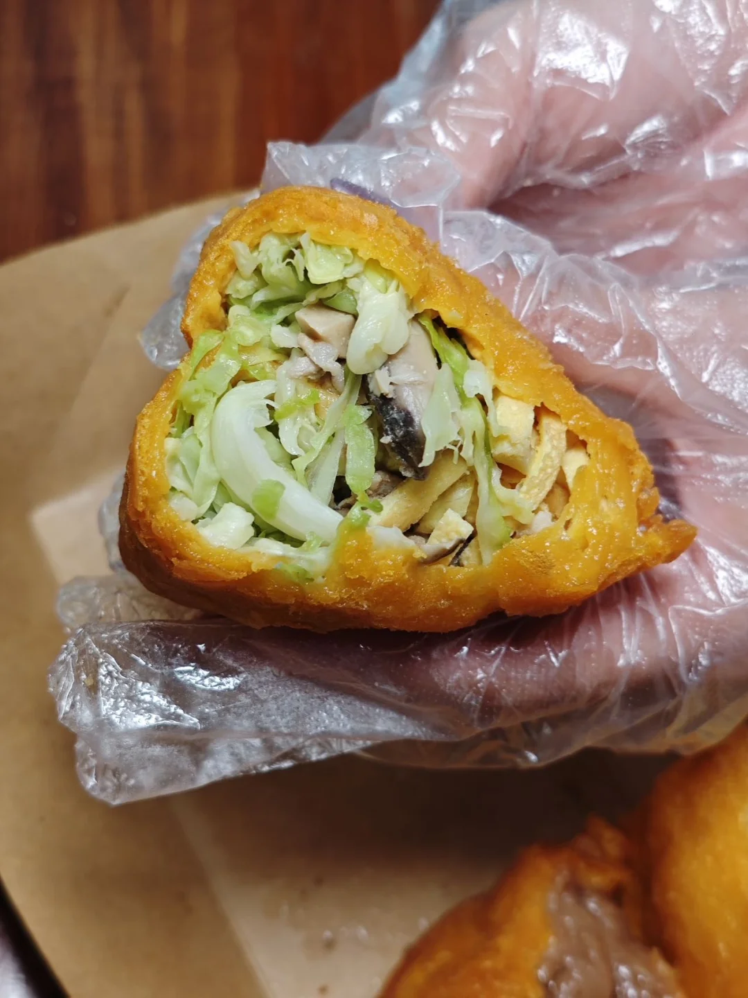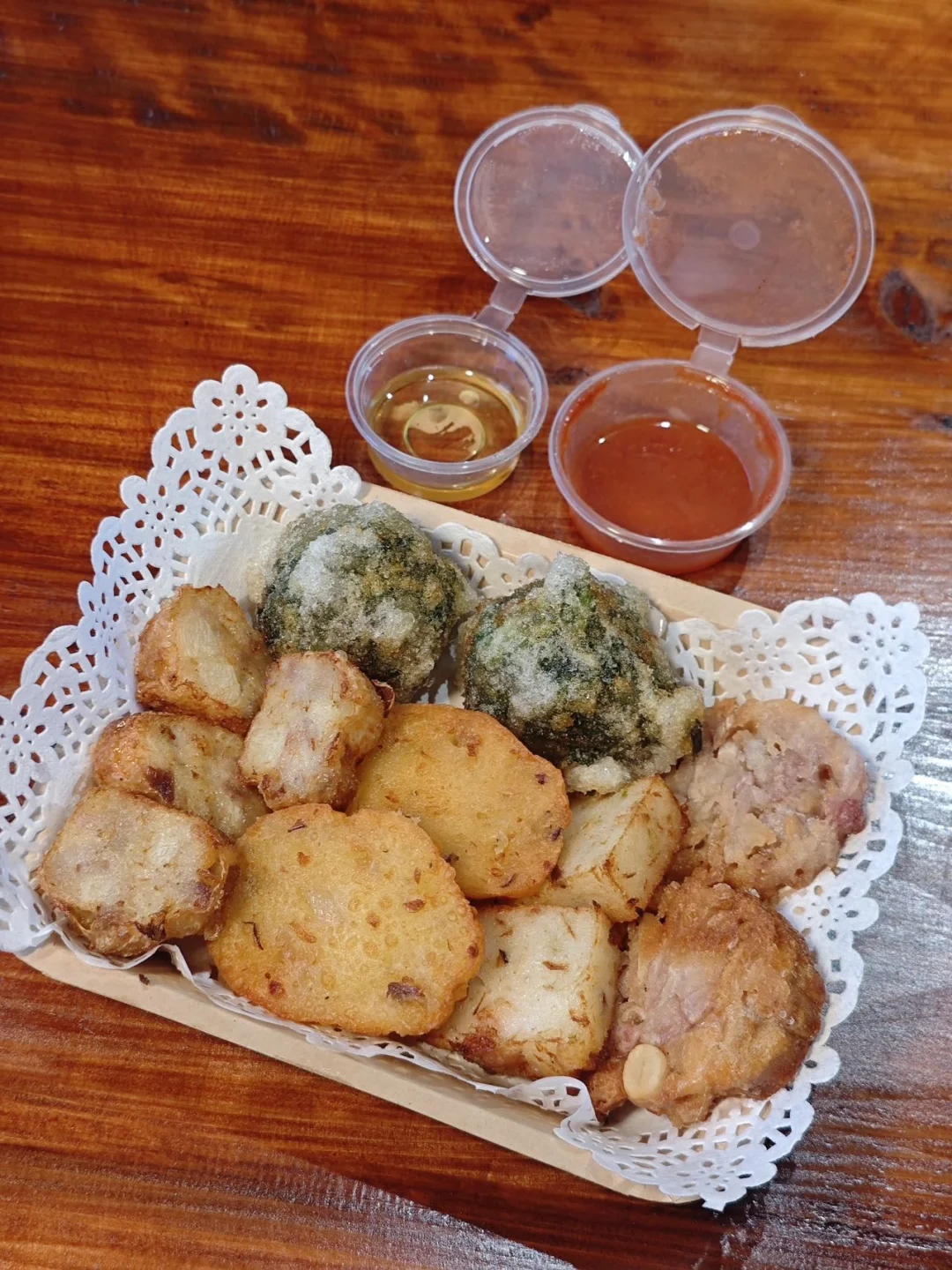 油粿炸得金黄诱人,外皮柔韧不腻,内馅咸甜交织;炸豆干外皮酥脆,内里软嫩,蘸上灵魂酱料,一口就上头,越嚼越香。