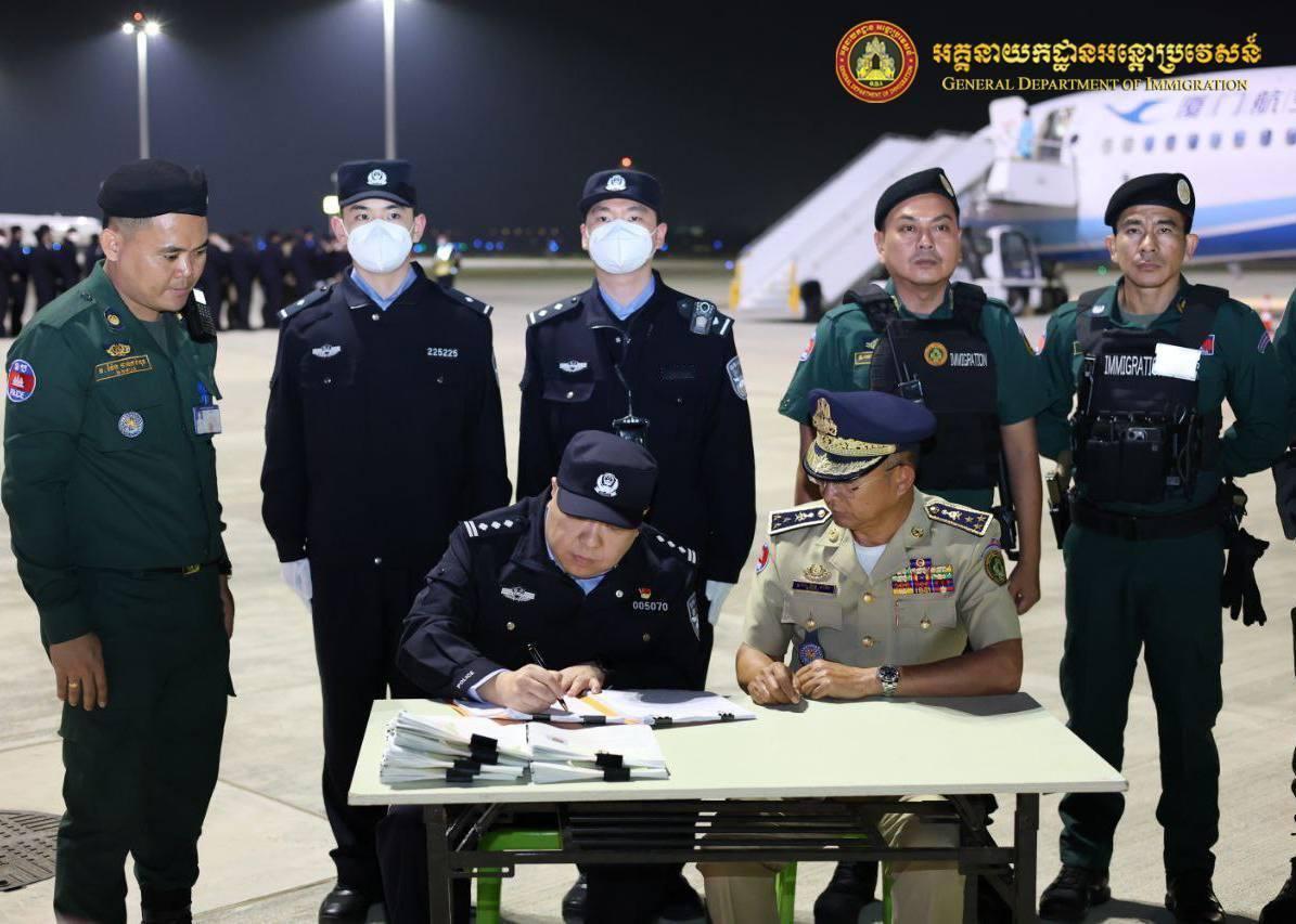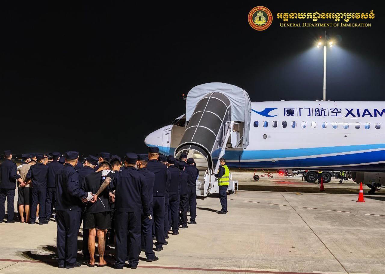 昨天,柬埔寨移民部门与中国驻柬大使馆通力合作,通过德崇国际机场包机,将319名中国籍男子遣送出境。