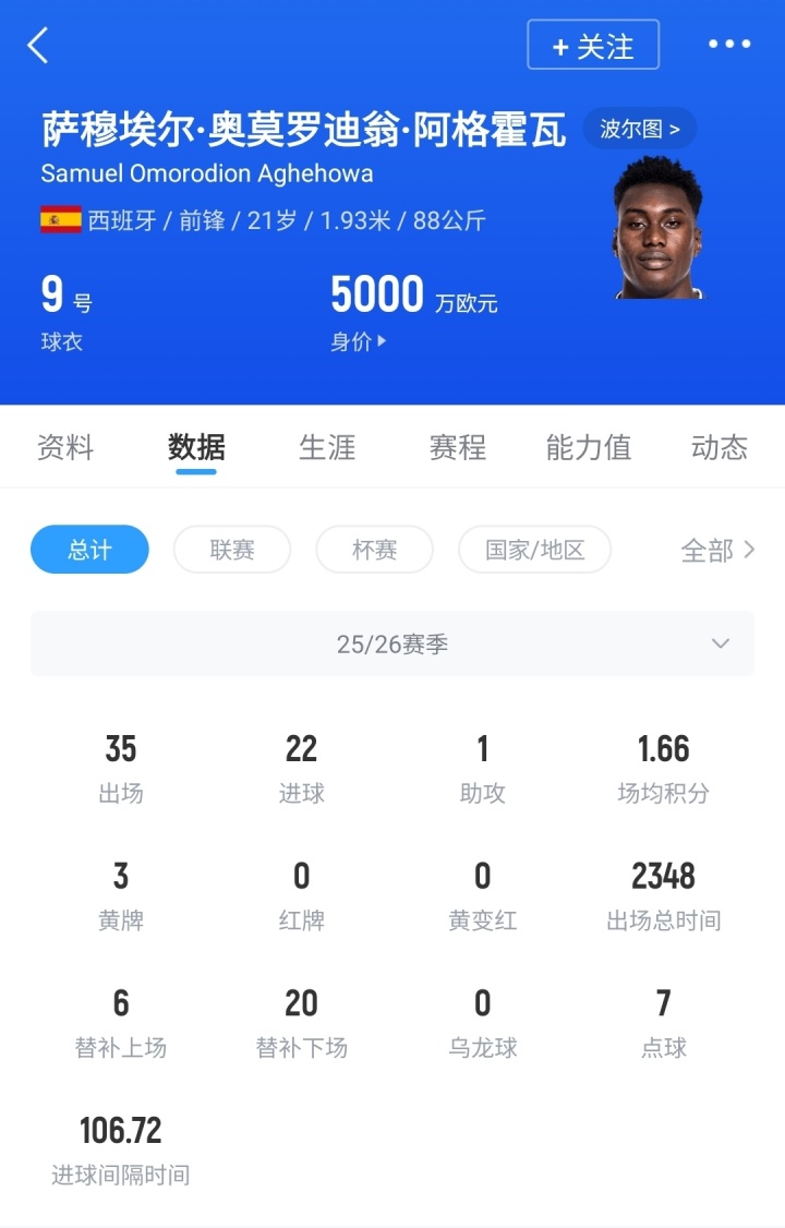 阿格霍瓦,场上司职前锋,本赛季代表波尔图出战35场比赛,打进22球,目前德转身价5000万欧。