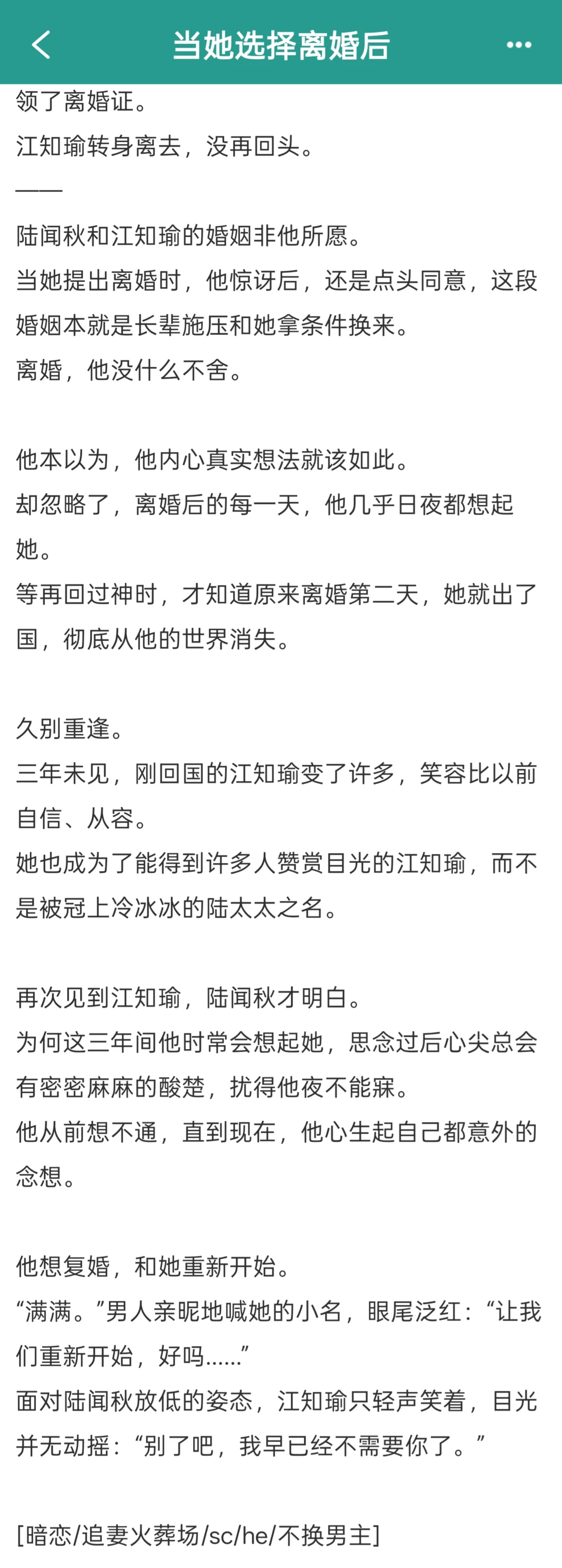 超级无敌爽的追妻火葬场!贵公子为爱低头,开篇就是男女主结婚三年,女主很快清醒离开,后期男主明白自己心意后追妻!前期女主爱男主,后面是男主很爱很爱女主,为了追回女主什么事都能做,非常深情啊啊啊啊啊啊然而女主心如铁石不给他机会,男主只能看着女主和别人交往,他连为爱做3的机会都没有,直接被女主无情赶走! 后期坚持不懈的努力总算把男配踢出局,以为自己能上位,结果女主还是不理他!男主几乎都是拿命在追妻的程度,虐他虐得超爽啊!