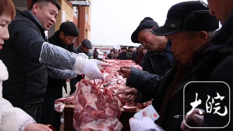 广场临时搭起的条案上,千余斤新鲜猪肉泛着润泽的光。几名村干部和志愿者忙着分割、称重、分装。“大娘,这份是您的,拿稳喽!”“大爷,天冷路滑,您慢点走!”一句句家常叮咛在寒冬里脱口而出,带着热气。