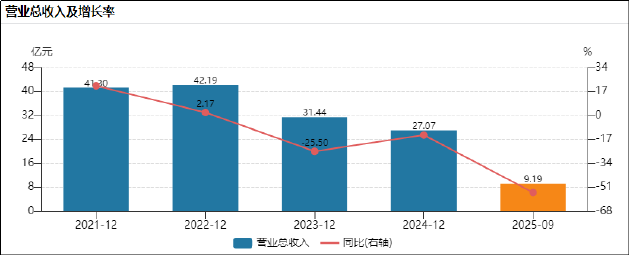 从财务数据看,公司的营收规模在2022年达到42.19亿元的峰值后便急转直下,2023年下滑25.5%至31.44亿元,2024年进一步萎缩13.84%至27.07亿元,已不及2018年的水平。进入2025年,下滑态势呈加速状态,前三季度营收仅9.19亿元,同比暴跌54.73%,全年营收预计将创历史新低。