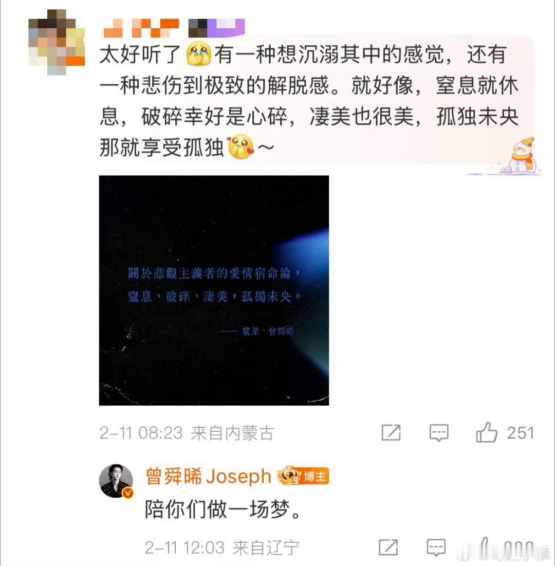 曾舜晞陪你们做一场梦曾舜晞一句“陪你们做一场梦”温柔到极致,认真回应每一份偏爱,双向奔赴的喜欢真的太好哭了。