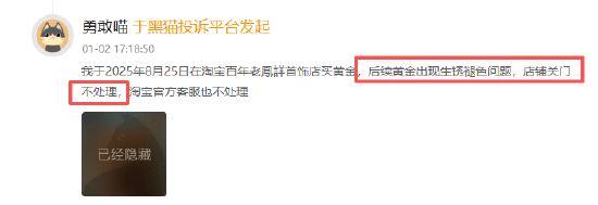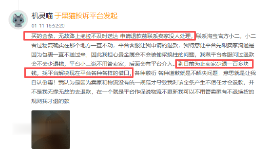 一月份贵金属交易市场持续火爆,有大量消费者选择购入实体金条/银条,或将自己之前购入的金饰卖出,有消费者向黑猫投诉反馈,自己下单后出现物流停滞/拖延不发货等情况,由于目前金价较高,担心运输过程中被调包,故申请退款,但申请平台介入后获得的退款莫名被扣除一部分。还有消费者表示自己购入的金饰在回收时被鉴定为假,寻求售后时却因为下单时间过去太久不能获得有效处理,还有的商家早已关店跑路。