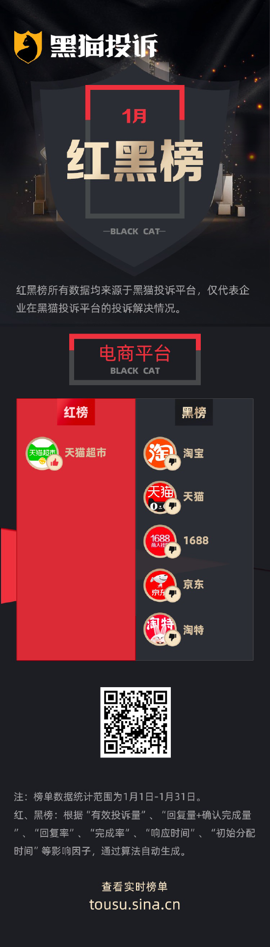 黑猫投诉发布1月企业投诉处理红黑榜单,数据均来源于黑猫投诉平台,反映了企业在黑猫投诉平台的投诉处理解决情况。