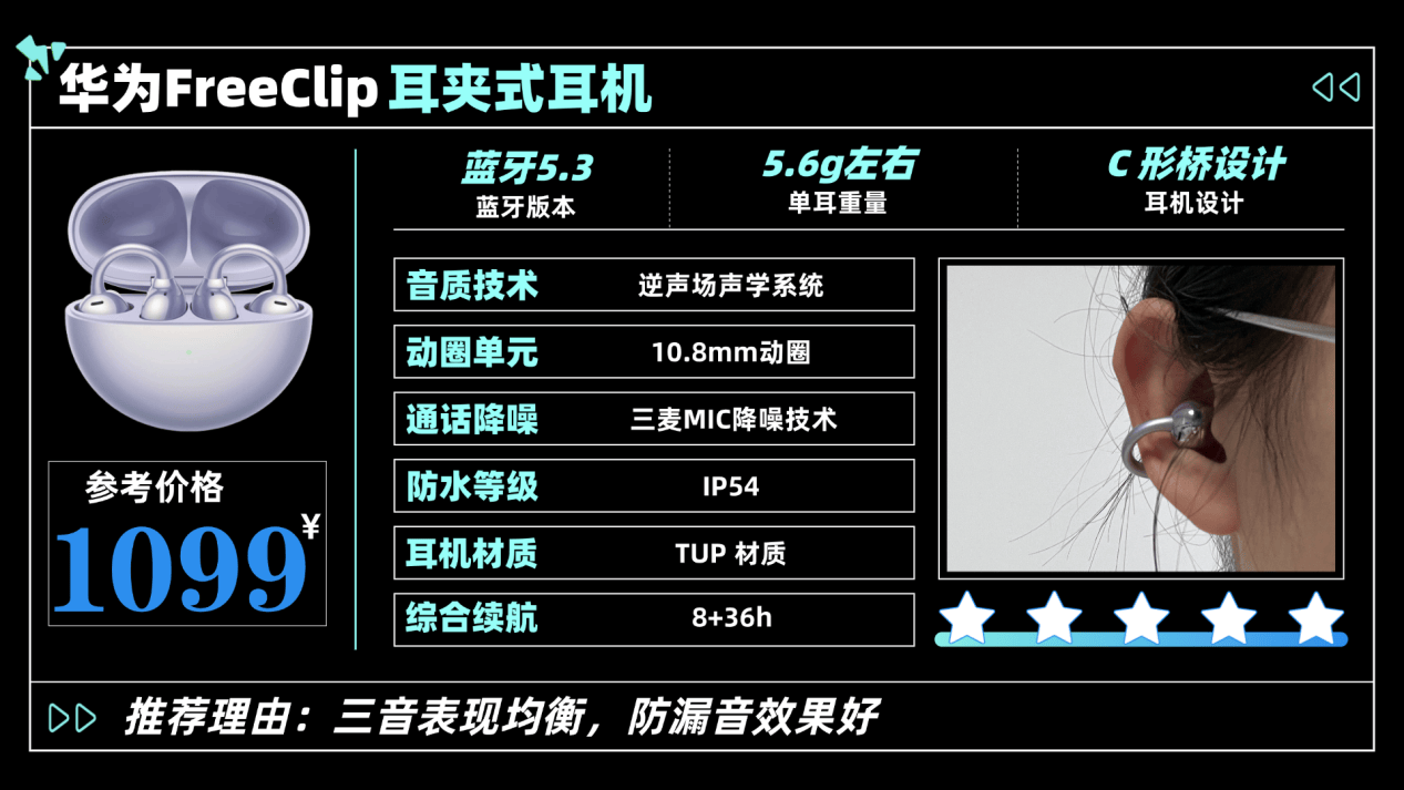 如果你的预算在千元以上,且是华为生态系统,那我建议你一定要试试华为FreeClip!如果你的预算在千元以上,那么这款是我的首推!华为FreeClip耳机的外观设计很有质感,采用磨砂烤漆工艺,在阳光下会有金属光泽,低调又有高级感。整体造型融合了时尚和科技感,受到了不少年轻用户的喜爱。