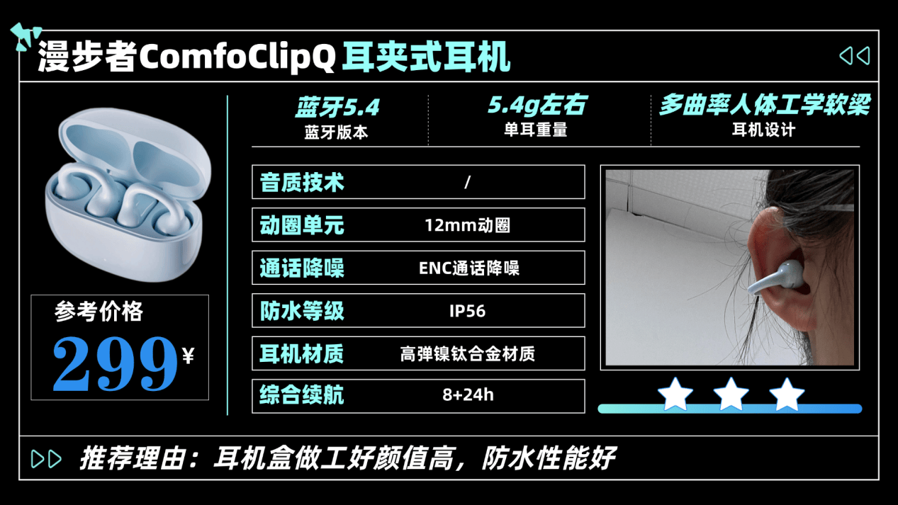 南卡clippro这款属于行业百元旗舰级标杆,耳机在音质和佩戴上属于双料性能王者,百元天花板级别耳机!音质方面,耳机搭载了更适合开放式耳机发声原理的新一代MCW多层复合宽环振膜,让耳机整体音质三频更加均衡。Clippro还支持Super sound OS2.0发烧级声学系统,音乐细节可以最大程度的还原,还原度高达98.6%,甚至可以对标很多千元级开放式耳机!