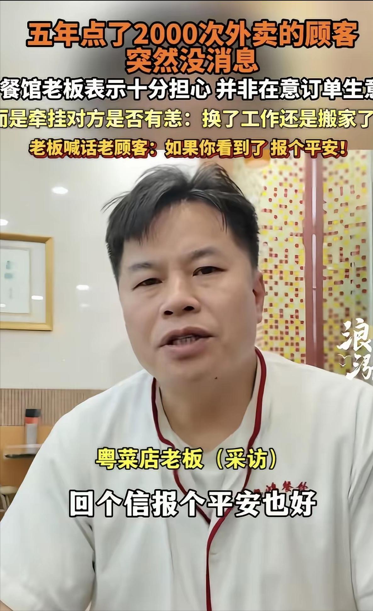 [中国赞]2月10日,广东佛山,一男子开了家粤菜馆,有个顾客5年点了2000次外卖,突然1年多都没下单,男子很是牵肠挂肚,他不是想挣这个顾客的钱,而是担心对方的安危,不知道是换工作了还是搬家了,男子喊话:如果你看到了,报个平安! (信源:浪涨新闻) 近日,广东佛山一位粤菜馆店主的视频刷爆全网,没有夸张炒作,没有狗血剧情,只是一句朴素又真挚的牵挂,却看哭了无数网友。 他不是为了宣传店铺、招揽生意,也不是为了索要欠款,而是为了寻找一位失联一年多的老顾客——一位5年里在他店里累计点了2000次外卖的陌生人,他全网公开喊话,不求对方再下单消费,只求能得到一句回应,知道对方一切平安。 这件事发生在佛山一家不起眼的粤菜馆,店主是个心思细腻的生意人,开店多年,凭着地道的口味和实在的分量,攒下了不少回头客,但最让他牵挂的,还是那位从未真正谋面、却像老朋友一样的线上食客。 没人知道这位顾客的姓名、年龄,也没人见过他的模样,大家只知道,他是这家店最忠实的粉丝,也是后台订单里最熟悉的存在。 从五年前第一次下单开始,这位顾客就成了店里外卖订单的“常客”,日复一日,风雨无阻。五年时间里,他累计下单足足2000次,平均下来每天1到2次,几乎包揽了自己的一日三餐。 久而久之,店主和后厨的伙计们,不用看订单备注,只要看到那个熟悉的收货地址,就知道该做什么、怎么做,早已把他的口味刻进了骨子里。 在店主心里,这位顾客早就不是单纯的消费者,更像是一位素未谋面的老朋友,一位住得很远、只能靠一份外卖维系联系的家人。 他们之间没有过一句对话,没有过一次见面,却凭着五年里一次次重复的订单,建立起了一种无声的默契,一份超越交易的羁绊。店主甚至常常念叨,哪天要是能在店里见到这位顾客,坐下来一起吃顿热乎饭、聊两句,就好了。 可这份延续了五年的默契,却在一年多前毫无征兆地按下了暂停键。那天之后,那个熟悉的收货地址,再也没有出现在店铺的后台订单里,那位每天准时下单的老顾客,就像人间蒸发了一样,彻底失联了。 起初,店主和伙计们并没有太在意,只当是对方临时出远门、换了口味,或是搬了家,想着用不了多久,就会再看到他的订单。 可一天、一周、一个月过去,订单依旧没有动静;半年、一年过去,那位顾客还是毫无音讯。店主的心,渐渐从疑惑变成了担忧,越来越不踏实。 他每天都会不自觉地翻看后台的历史订单,看着那2000条记录,心里满是猜测:他是不是遇到什么难处了?还是身体出了状况?是搬去了别的城市,还是有了别的变故? 身边的人起初还打趣他,说他太较真,不过是少了一个大客户,犯不着这么牵肠挂肚,做生意本来就是来来往往,有人来有人走很正常。 可只有店主自己知道,他担心的从来不是生意,不是少赚那点钱,而是那位像老朋友一样的顾客的安危。他甚至会悄悄反省,是不是自己哪次的菜品没做好,是不是哪里做得不够周到,才让对方不再下单。 日子一天天过去,牵挂越来越深,店主实在放心不下,最终决定鼓起勇气,拍了一条短视频,在社交平台公开喊话那位失联的老顾客。 视频里,他没有华丽的辞藻,语气朴实又真诚,只是对着镜头说:“那位五年里在我家点了2000次外卖的朋友,我不知道你是谁,也不知道你遇到了什么事,我不求你再下单,只求你看到这条视频后,能给我报个平安,哪怕只是简单说一句‘我很好’,我就安心了。” 视频一经发布,很快就引发了全网热议,无数网友被这份纯粹的善意打动。大家的猜测里,没有恶意,全是美好的期许,所有人都盼着,那位顾客能看到喊话,能及时出现,报一声平安。 其实,这件事之所以能打动这么多人,核心从来都不是2000次外卖订单,而是那份不掺杂任何利益的牵挂,是陌生人之间最纯粹的善意。 如今的我们,生活在快节奏的都市里,步履匆匆,每天打交道的人很多,可真正能放在心上的,却寥寥无几。我们习惯了冷漠,习惯了疏离,习惯了人与人之间的隔阂,渐渐忘了,原来一份简单的牵挂,一句真诚的问候,就能带来无尽的温暖。
