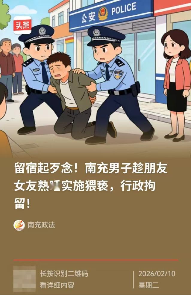 朋友妻不可欺!四川南充,男子和女朋友一起请好哥们吃宵夜,饭后,男子邀请朋友去自己家住。第二天早上男子有事临时外出,好哥们竟然潜入男子和女友房间,对他正在熟睡的女朋友进行欺侮! 四川南充,一名男子带着女友,请自己的好哥们吃宵夜,宵夜结束后,见天色已晚,便热情邀请哥们去自己家住。 没曾想这份真心相待换来的却是背叛,第二天早上男子因急事临时外出,好哥们竟趁虚而入,潜入他和女友的房间,对熟睡的女友实施猥亵,彻底撕破了兄弟情谊的伪装。 男子和这位好哥们相识多年,关系十分要好,平日里互帮互助,男子一直把他当成亲兄弟,毫无防备,经常带着女友和他一起聚餐玩耍,从未想过对方会有不轨之心。 事发当晚,男子想着许久没和哥们相聚,便约上对方,带着女友去了家附近的宵夜摊。几人找了个角落坐下,点了小吃和饮品,一边吃喝一边畅谈近况,气氛十分融洽,谁也没料到,这场平常的聚餐会成为背叛的开端。 几人吃了两个多小时,直到深夜才尽兴而归。路上,好哥们借着酒意念叨着住处太远、赶路不便,男子心疼兄弟,便主动邀请他去家里留宿,说家里有空房间,住得更自在。 好哥们当即答应,嘴上不停道谢,脸上满是感激,可这份感激背后,藏着不怀好意的心思。男子毫无察觉,带着女友和哥们回到家,简单收拾出一间客房安排好他,便和女友回房洗漱休息,全程毫无异样。 第二天一早,天刚蒙蒙亮,男子就被工作急事的电话吵醒,对方要求他立刻赶去处理。男子匆匆起身,轻手轻脚洗漱完毕,生怕吵醒熟睡的女友和哥们,帮女友掖好被角、关上房门后,便急匆匆出门,临走前还特意给哥们发消息告知此事。 男子走后没多久,好哥们就醒了。他在房间里静坐片刻,仔细确认家里只有熟睡的女子一人后,心底的恶念彻底滋生。 他轻手轻脚打开客房门,踮着脚尖走到男子和女友的房门口——房门只是轻轻掩着,大概是男子走得太急忘了锁,也或许是他从未防备过自己的好哥们。 好哥们轻轻推开门走进房间,此时光线昏暗,女子正熟睡在床上,丝毫没有察觉危险。他慢慢走到床边,目光里满是贪婪和猥琐,彻底忘了兄弟情谊和“朋友妻不可欺”的底线。 犹豫片刻后,他壮着胆子伸手,悄悄对女子实施猥亵,动作格外谨慎,可还是不小心碰到了女子的手臂。 女子本就睡得不沉,被触碰后瞬间惊醒,看清眼前是男友的好哥们,还做出如此龌龊的举动,当场被吓得浑身僵硬、大脑空白。 好哥们见女子醒来,顿时慌了神,手足无措生怕她大喊大叫。女子反应过来后,心底的恐惧和厌恶涌上心头,她强压着害怕,猛地推开对方,蜷缩在床角,吓得浑身发抖、说不出话。 好哥们知道自己已经暴露,不敢多做停留,生怕女子报警、男子回来算账,慌乱中转身就跑,连自己的东西都忘了拿,匆匆冲出男子家,消失在清晨的街头,只留下满心恐惧和屈辱的女子独自在房间里发抖。 没过多久,男子处理完急事匆匆赶回,一进门就察觉到家里的压抑气氛。他快步走进卧室,看到蜷缩在床角、满脸泪痕的女友,顿时慌了神,连忙上前询问。女子再也忍不住,扑进他怀里痛哭,把被其好哥们猥亵的事情一五一十说了出来。 男子听完瞬间怒火中烧,不敢相信自己的好哥们会做出这种背叛自己、伤害女友的龌龊事,这份背叛比任何伤害都让他心痛。他紧紧抱着女友安抚,当即拿出手机报警,希望警方尽快找到涉事男子,还女友一个公道。 据悉,警方接到报警后迅速介入,根据男子提供的线索和小区监控,很快锁定了涉事男子身份,目前正在全力追捕中。 相关人士提醒,遭遇猥亵后,黄金72小时是固定证据的关键,务必第一时间报警,切勿隐忍;人际交往中,即便关系再好,也要保持防备、守住边界。男子和女友后续也在警方指导下固定了证据,等待调查结果和公正处置。 对此,你们有什么看法,欢迎评论留言~