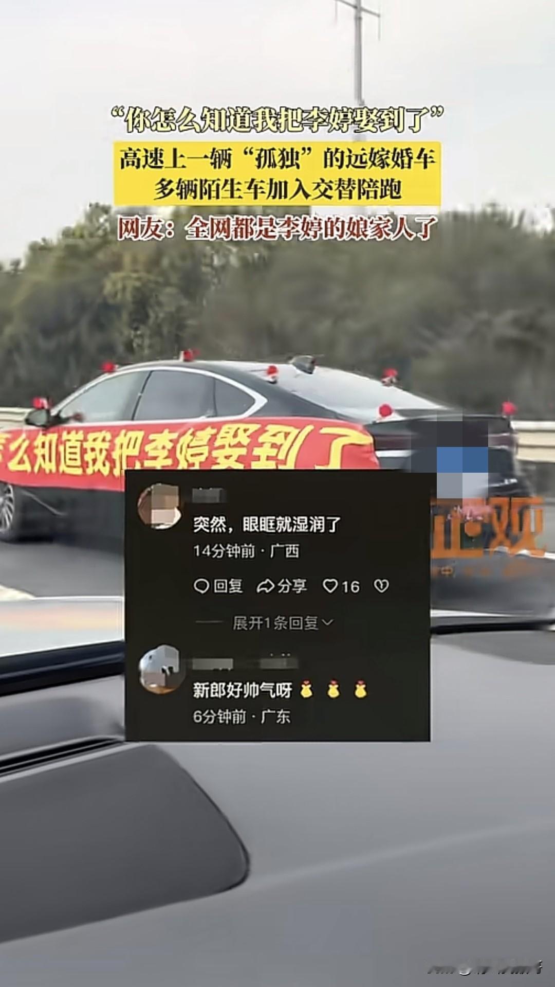 “你是一个人吗?让我陪你一起”!这个叫“李婷”的孤独的远嫁女孩,让一路上的热心司机都成了她的“娘家人”。沿途的司机在得知新郎新娘坐在这独行婚车上,都纷纷交替加入这“迎亲”的队伍中来,让这对原本孤独的新人,成为全网最幸福的一对夫妻。一路上所有看到这辆挂着“怎么知道我把李婷娶了”横幅的车辆,都为他们送上新婚的祝福,并打开双闪一路互送,网友们调侃说,今年结婚最火爆的场景出现了。