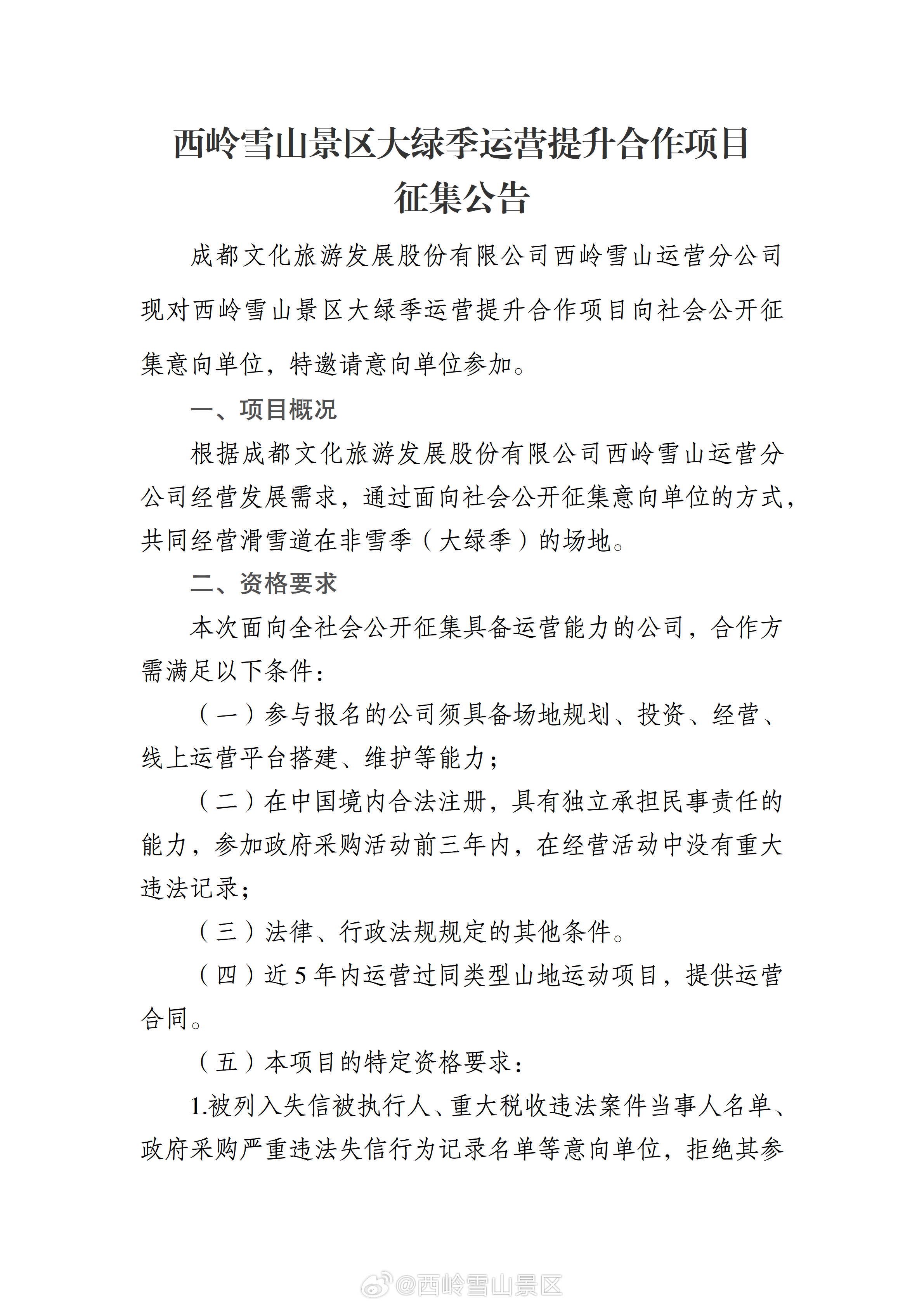 西岭雪山景区大绿季运营提升合作项目征集公告