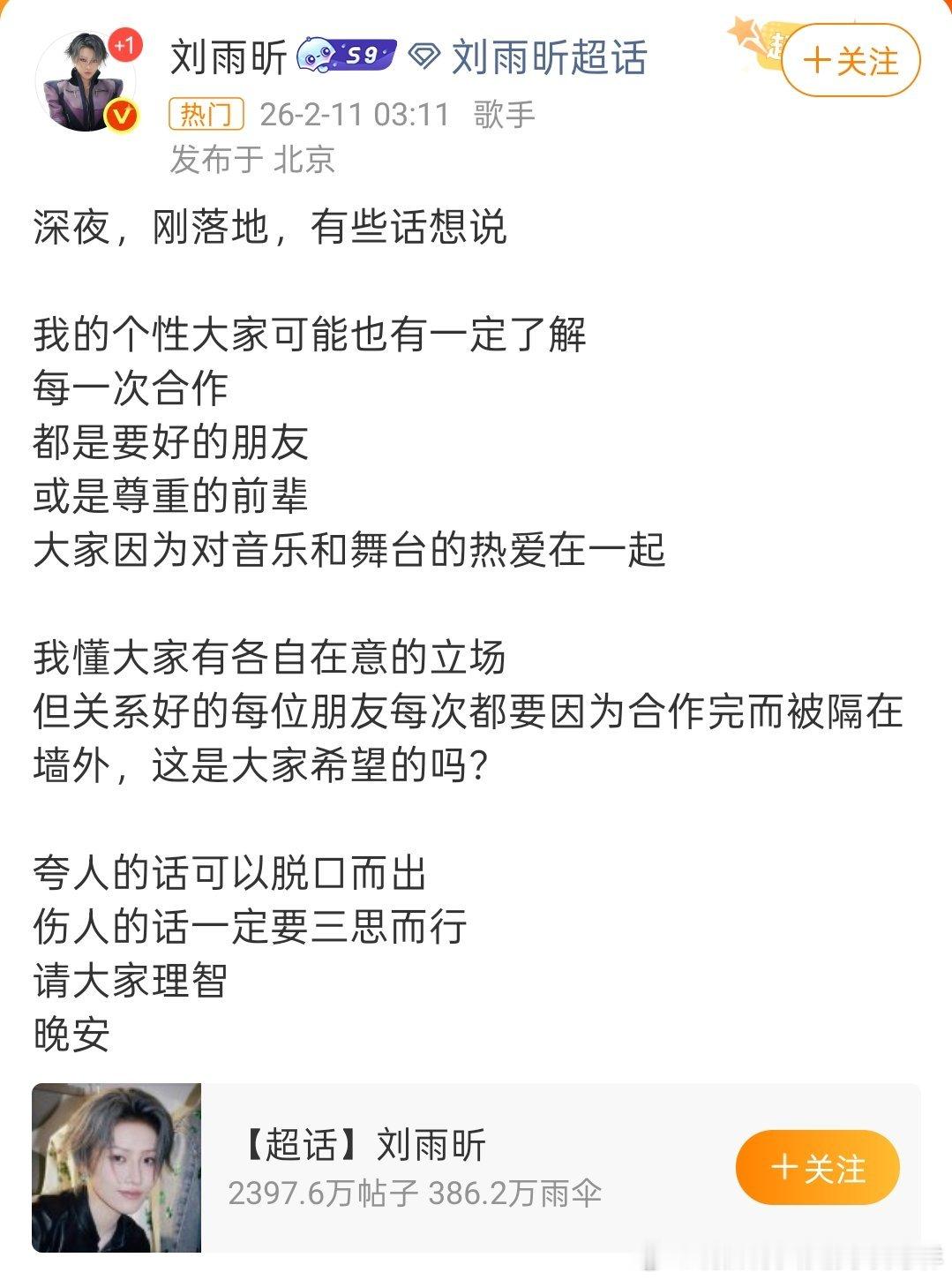 刘雨昕 伤人的话一定要三思而行这是咋了? 所以是跟谁合作起摩擦了?