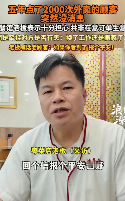 近日,广东佛山,一男子开了家粤菜馆,有个顾客5年点了2000次外卖,突然1年多都没下单,男子很是牵肠挂肚,他不是想挣这个顾客的钱,而是担心对方的安危,不知道是换工作了还是搬家了,男子喊话:如果你看到了,报个平安!网友:可能吃腻了,换了一家,也可能结婚了不用吃外卖了,还可能噶了! 在广东佛山,有这么一位开粤菜馆的老板,最近心里老是七上八下的,像压了块石头,他满世界找一个人,不是为了讨债,也不是为了推销,纯粹是心里那个疙瘩解不开,这事说起来挺怪,但细琢磨,全是人情味。 这位让老板牵肠挂肚的“神秘人”,其实就是个点外卖的老主顾,但这主顾可不一般,整整五年时间,雷打不动,从没露过面,光外卖单子就下了快两千次。 这是啥概念?平均下来几乎天天都在吃,有时候一天还得整两顿,简直把这家馆子当成了自家的私人小食堂。 咱们都知道,做餐饮的阅人无数,但这人太特别了,老板连人家长圆的扁的都不知道,甚至全名都叫不上来,但这人的口味,后厨闭着眼都能背出来:一点辣不沾,最爱白切鸡、豉汁排骨和虾饺,还得雷打不动配碗热汤。 每次备注都客客气气的,从来没给过差评,也没找过茬,时间久了,虽然没见过面,但那种默契早就有了。 只要那个熟悉的地址一弹出来,后厨都不用看单子,直接开火,老板也是实诚人,看这老熟客,经常偷偷给加个卤蛋,或者多舀一勺例汤,也不收钱,也不邀功,就图个心里踏实。 可就在大概一年前,这根弦突然断了,那个天天准时报到的订单,毫无征兆地消失了。 起初几天,老板也没当回事,心想人家可能是出差了,或者回老家探亲,再不就是这两天忙忘了,可这一等就是个把月,甚至更久,那个熟悉的地址再也没在屏幕上亮起过,老板这就坐不住了,没事就翻后台记录,越翻心里越没底。 他脑子里开始演电影似的瞎琢磨:是不是这人换工作离开佛山了?是不是搬家了?还是说身体出了啥毛病,遇上啥难坎了?他甚至开始怀疑自己,是不是哪次饭菜做咸了,或者是送晚了让人家不高兴了?但他打心底里希望,对方只是换了种生活方式,而不是遭遇了什么不测。 跟身边人念叨的时候,老板那话听着特别真:“我真不是图赚他那点饭钱,这五年的交情,哪怕是隔着网线,也比生意重要。我就想听一声,他现在平平安安的,哪怕以后再不来吃都行。” 实在憋不住了,这老板干脆拍了条视频发到网上,对着镜头隔空喊话,话里话外透着股朴实劲:“那位点了两千次外卖的老朋友,你要是能刷到,给个信报个平安就行,不用你再花钱点餐,只要你人好好的,我就放心了。” 他在店里还特意留了个位置,叫“外卖老友专座”,意思很明白:只要你肯来,随时欢迎,热汤热饭管够,这顿饭老板请。 这视频一下子就火了,网友们看着都挺感动的,大家的猜测也是五花八门,有的说:“估计是吃了五年实在吃腻了,想换换口味”,有的猜:“搞不好是结婚了,家里有人做饭,这就不用点外卖了”,还有人半开玩笑半认真地祈祷:“只要人没事就行,可别是那种坏消息”。 网上也有人质疑是不是剧本炒作,但街坊邻居都知道,这老板平时就是个闷头做事的实在人,根本没必要拿这事博眼球,他图的,真就是那一句“我没事”。 在这个快节奏的水泥森林里,大家都是各忙各的,一份热乎的外卖,往往是很多独居打工人一天里最温暖的时刻。 而这位老板,守住的不仅仅是一个灶台,更是一份陌生人之间难得的信任和牵挂,五年两千单,那不是冷冰冰的数据,是日复一日的陪伴,这一年多的苦等,也不是为了那几块钱利润,是人心的温度。 到现在为止,那个神秘顾客还没露面,但我们都愿意相信最好的结局:也许他升职加薪去了别的城市,也许他洗手作羹汤有了自己的小家。 不管怎样,这种朴素的善意,在如今这个社会里,真的太珍贵了,希望老板能早点等到那句平安,也希望每一个在外漂泊的人,都能被这样温柔地惦记着。 对此你怎么看? 信源:浪涨新闻